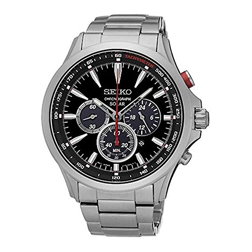 Stainless steel case with a stainless steel bracelet. Fixed stainless steel bezel. Black dial with luminous silver-tone hands and index hour markers. Minute markers. Tachymeter markings around the outer rim. Dial Type: Analog. Luminescent hands and markers. Date display between the 4 and 5 o'clock positions. Chronograph - three sub-dials displaying: 60 second, 60 minute and 24 hour. Seiko caliber V175 solar quartz movement. Scratch resistant Hardlex crystal. Pull / push crown. Solid case back. Case size: 44.7 mm. Case thickness: 12 mm. Round case shape. Band width: 22 mm. Deployment clasp. Water resistant at 100 meters / 330 feet. Functions: chronograph, tachymeter, date, hour, minute, second. Sport watch style. Watch label: Japan Movt. Seiko Solar Chronograph Black Dial Stainless Steel Mens Watch SSC493.