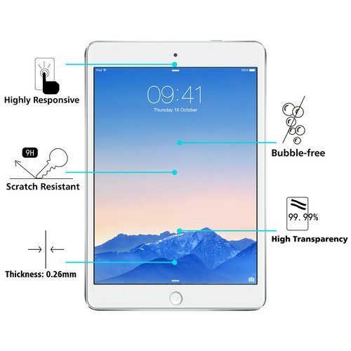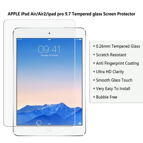 Compatible Model(s): This high quality tempered glass screen protector film is designed for New IPad (2017) / iPad Air / Air 2 / Pro 9.7/ , with high transparency and clear display screen.