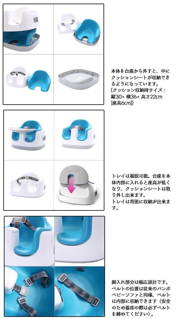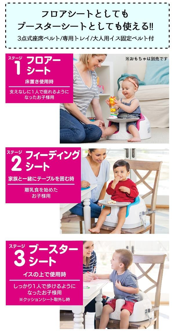 | お子様の成長に合わせ支えなしに座れるようになった時(生後約6ヶ月頃)~36ヶ月頃までと長く使える3ステージシートです。床に置いて使用するベビーソファとしてはもちろん、大人用イスの座面に取り付け、補助イスとして使用する事もできます。お子様の成長やシーンに合わせてお使い頂けるマルチシートです。 |