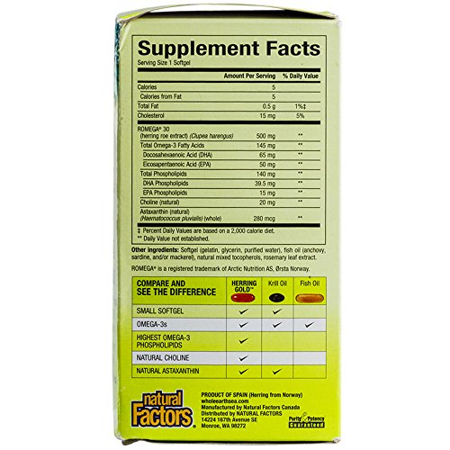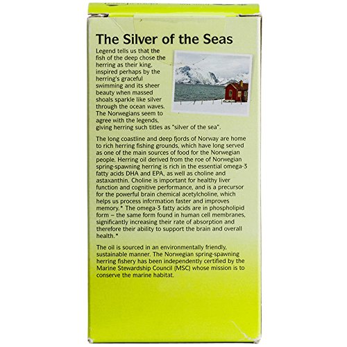 Studio : Natural Factors Publisher : Natural Factors Binding : Health and Beauty Product Description Herring Gold from the Silver of the Sea Legend tells us that the fish of the deep chose the herring as their king, inspired perhaps by the herring's graceful swimming and its sheer beauty when massed shoals sparkle like silver through the ocean waves. The Norwegians seem to agree with the legends, giving herring such titles as "silver of the sea". The long coastline and deep fjords of Norway are home to rich herring fishing grounds, which have long served as one of the main sources of food for the Norwegian people. Herring oil derived from the roe of Norwegian spring-spawning herring is rich in the essential omega-3 fatty acids DHA and EPA, as well as choline and astaxanthin. Choline is important for healthy liver function and cognitive performance, and is a precursor for the powerful brain chemical acetylcholine, which helps us process information faster and supports memory. The omega-3 fatty acids are in phospholipid form - the same form found in human cell membranes, significantly increasing their rate of absorption and therefore their ability to support the brain and overall health. The oil is sourced in an environmentally friendly, sustainable manner. The Norway spring-spawning herring fishery has been independently certified by the Marine Stewardship Council (MSC) whose mission is to conserve the marine habitat. 0