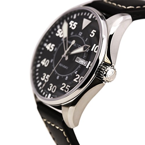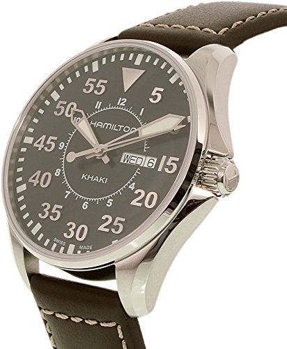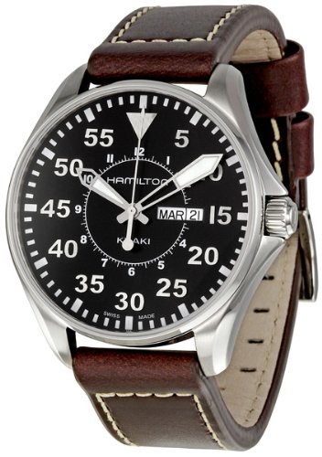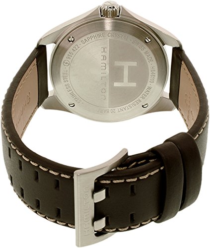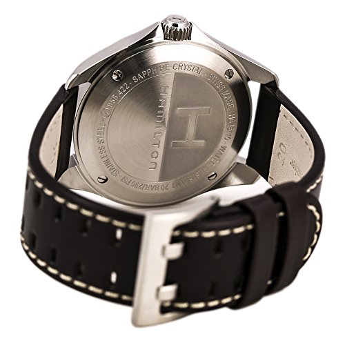 ReleaseDate : 2014-09-30 Studio : Hamilton Publisher : Hamilton Binding : Watch Product Description Hamilton is established as one of the leading watchmakers in the world with a proven reputation for creating elegant and reliable timepieces. Brushed and polished stainless steel case, Screw-in caseback, Black dial, White printed Arabic numeral hour markers, silvertone applied Arabic numeral minute markers, Luminescent indices, Silvertone arrow luminescent hands, Sweep second hand, Day and date at the 3 o'clock position, Brown oil leather strap, Pin buckle, Sapphire crystal, Screw-down crown, Swiss quartz movement, ETA caliber 955.422, Water resistance to 20 ATM/200 meters/660 feet, Case measurements are 42 mm in diameter x 11 mm thick, Strap measurements are 20 mm wide x 8 inches long. 0