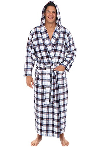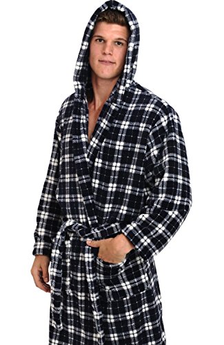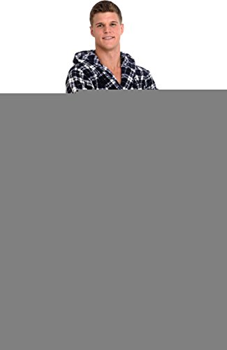Del Rossa Mens Fleece Robe, Long Hooded Bathrobe, Large XL Dark Blue and White Plaid (A0125P07XL)