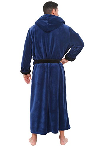Del Rossa Mens Fleece Robe, Long Hooded Bathrobe, Large XL Navy Blue with Black Contrast (A0125NBBXL)