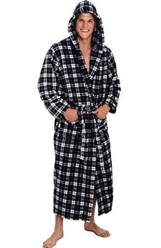 Alexander Del Rossa Mens Fleece Robe, Long Hooded Bathrobe, Small Medium Grey Black and White Plaid (A0125R73MD)