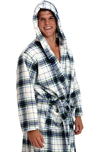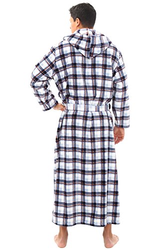 Del Rossa Mens Fleece Robe, Long Hooded Bathrobe, Large XL Blue on White Plaid (A0125P06XL)