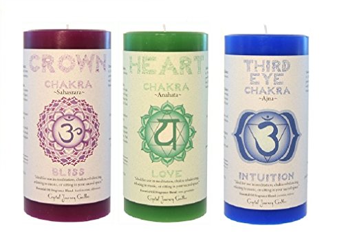 Crystal Journey 3"x6" Pillar Chakra candles bundle of 3 (Crown Chakra, Heart Chakra, Third Eye Chakra)