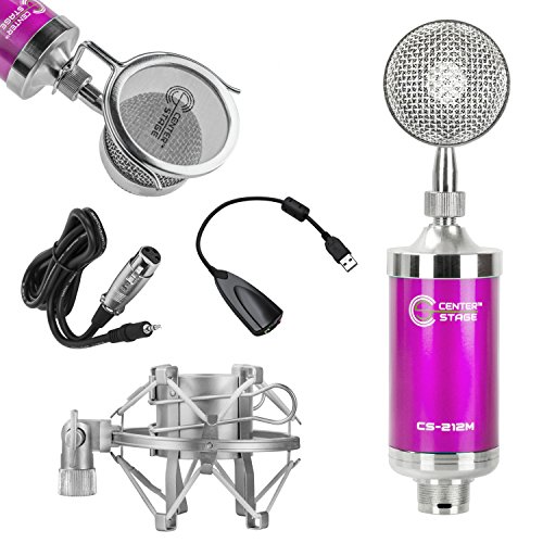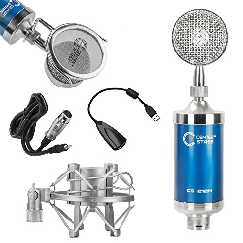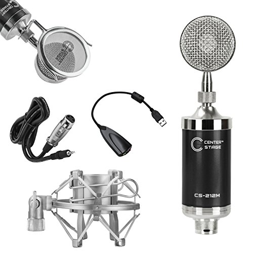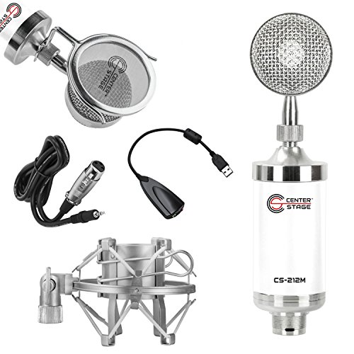 The CenterStage CS-212 Studio Condenser Microphone provides professional studio-grade audio quality packed in an attractive, vintage-style 'lollipop' form factor. The CS-212 Condenser Microphone was designed to shine with its photogenic metallic exterior, gold-plated diaphragm capsule, optimized electronic circuitry for higher dynamic range, and PC/Mac/Linux-compatible - all at an unbeatable price. The CS-212 Studio Condenser Microphone bundle is perfect for broadcasting, podcasting, vocal recording, guitar recording, brass instrument recording, and drum overhead recording. This bundle includes the CS-212 Condenser Microphone, Pop Filter Shield, Aluminum Shockmount, 8ft. XLR-to-3.5mm Cable, and USB Soundcard (w/Mic & Headphone jacks).