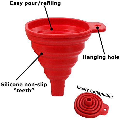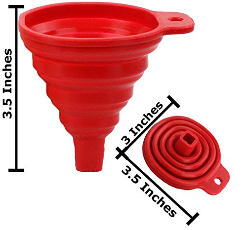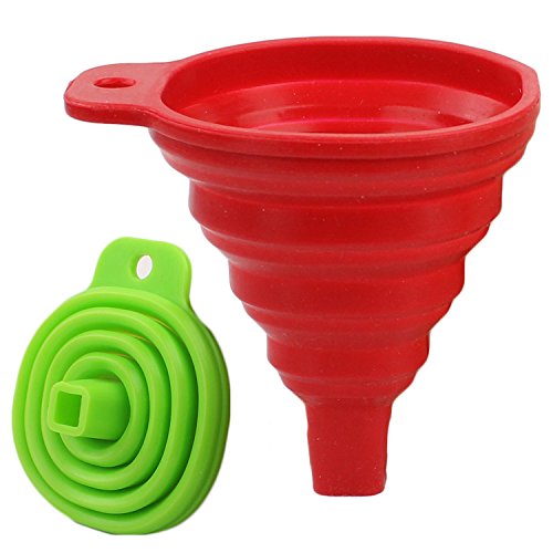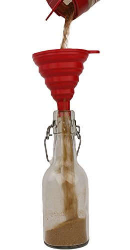 No more bulky, space-hogging gadgets in your kitchen! Save storage space with our clever collapsible funnels. Our silicone funnels fold up from a fully expanded height of 3.5" down to approximately 1/2 inch tall. Slide it in any kitchen drawer or hang it on the wall using the side hole. Made from thick, food-grade silicone, the funnel is BPA-free and dishwasher safe. Sturdy, textured "teeth" on the body keep the funnel securely in place and makes for a mess-free transfer of liquids or oils and dry powders or spices. The 2-pack includes 1 red and 1 green funnel. No more olive oil or sea salt spills all over your kitchen counters! The holder tab design will cleanly transfer liquids or dry powders into your jar, bottle or cup. 0 |
