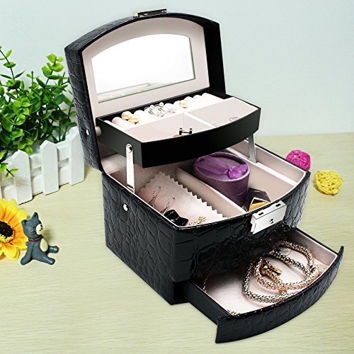 - DIVERSIFIED STORAGE: the lid opens to reveal 3 layers of divided storage, ring rolls, 2 pull out drawers on the bottom, and a total of 5 compartments to place your jewelries and accessories.