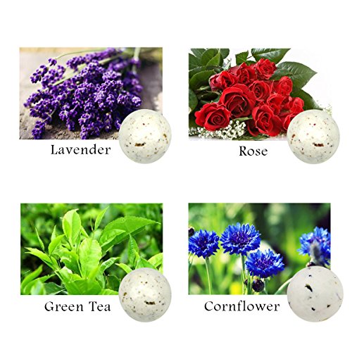- 【4 FLAVORS】-- Our handmade fizzers bath kit (each about 1.4Oz) contains 4 different flavors that will meet your unique needs. Rose bath salt: Whitenning and hydrating; Lavender bath salt: Sleep peacefully, relieve stress; Cornflower bath salt: Refreshing and itching; Green tea bath salt: Soften skin, improve tension.