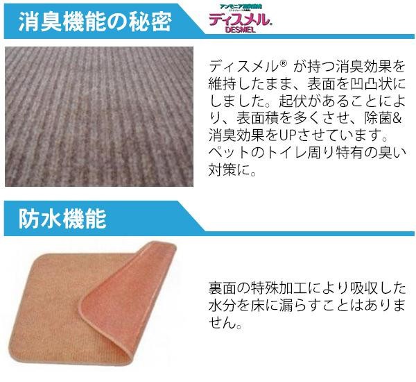 除菌力に優れた除菌繊維である「銀世界(R)」と、ペット臭やトイレなどのアンモニア臭を吸着し消臭する繊維である「ディスメル(R)」を使用したペット用マットです。裏面の特殊加工により、吸収した水分を床に漏らすことがありません。吸収・消臭効果は天日干しや洗濯によって回復、いつでも清潔な状態でお使いいただけます。 |