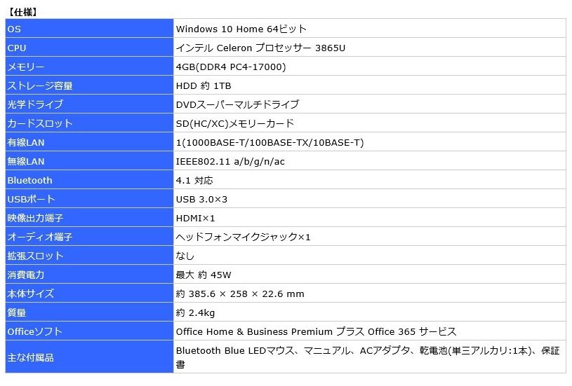 ●打ちやすいキーボードなど快適な使いやすさ独立テンキーと18.7mmのキーピッチで、デスクトップPCに近い感覚で入力できます。また、手首への負担を軽減するため、パームレストとキーボードの高さを揃えたフラットな構造を採用。その他にも、使いたいアプリをボタン1つで起動できる「ワンタッチスタートボタン」など、使いやすさにとことんこだわっています。本体カラーは、清潔感のあるエクストラホワイトです。●性能と操作性を両立したスタンダードノートPCスムーズに使える充実の基本性能。先進のデュアルコアCPUにより、Office文書作成はもちろん、高画質なネット動画の視聴も快適に行えます。メモリは、省電力を実現しながらデータ転送速度をさらに向上させた高速DDR4メモリを採用。また、大容量約1TBハードディスク内蔵で、仕事や趣味の大切なデータを安心して保管できます。さらに、電池1本で使える「Bluetooth マウス」を添付しているので、ケーブルなしでスムーズに操作できます。●スリムボディと臨場感あるサウンド本体厚22.6mmのスリムボディで、狭いスペースにもコンパクトに収納できます。サウンド再生では、音場生成技術により、「より自然な音、その場で聞こえるような音」を楽しめるヤマハ製 AudioEngineを搭載。イヤフォン/ヘッドフォン使用時には、あたかも画面から音が出ているかのように聞こえる「イマジナリースピーカ」機能など、映像や音楽コンテンツをより一層楽しめます。