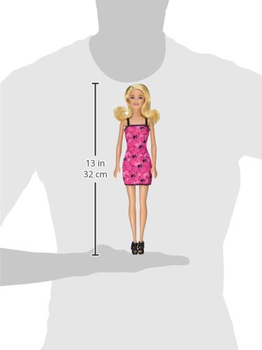Pink-tastic style is coming your way! Barbie doll models an ultra cute look in an ultra-cute Barbie print. The pink and black dress makes a statement with big hearts and classic Barbie icons. Barbie doll accessorizes a-doll-ably with a silo necklace and cute platform shoes. Doll cannot stand alone. Ages 3 and older.Feature