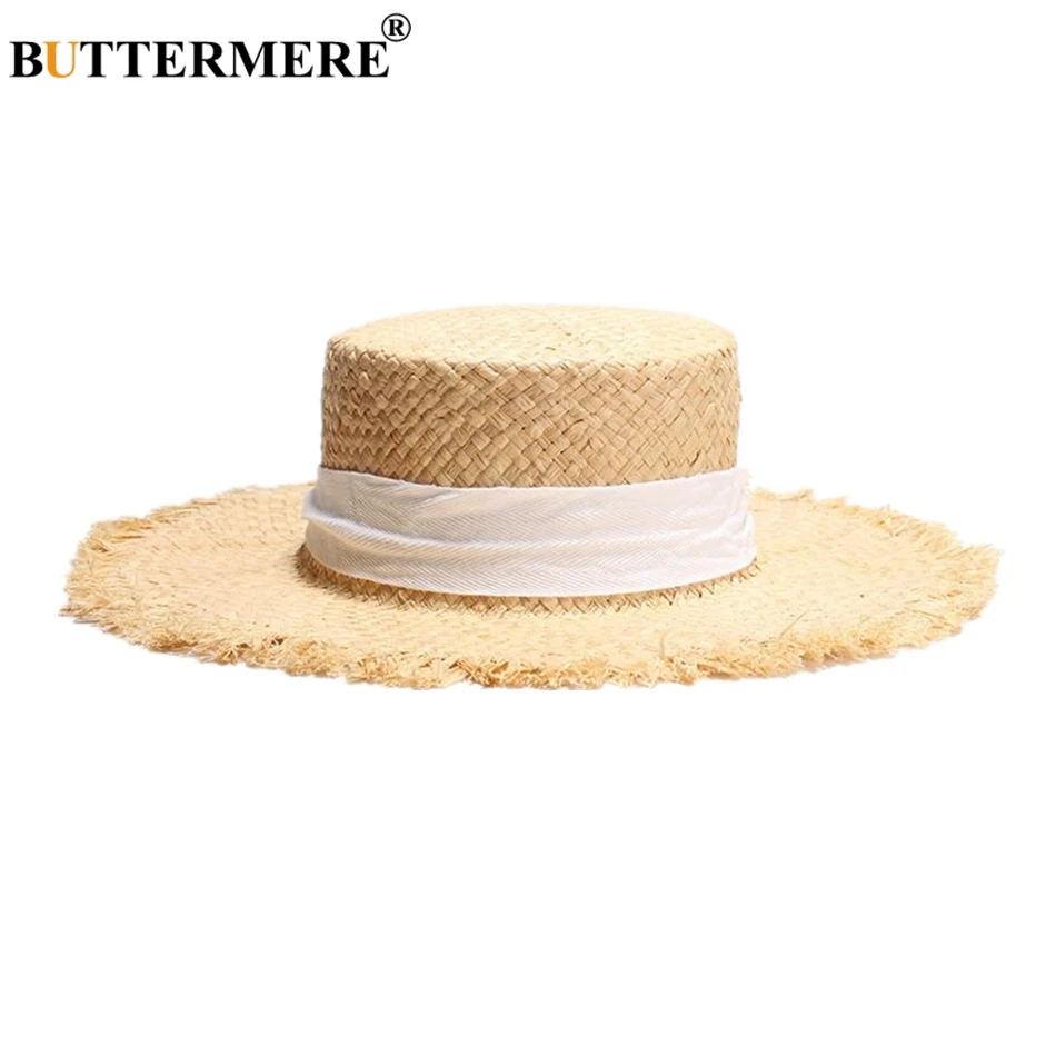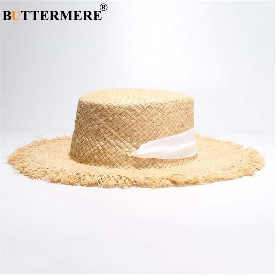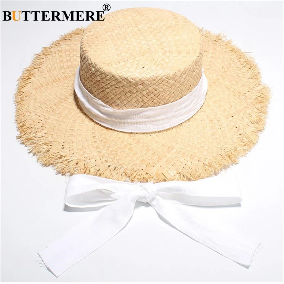 buttermereブランド女性ボートに乗る人ラフィアわら太陽の帽子レディース春夏広いつばファッションカジュアルレースアップビーチフラットキャップ