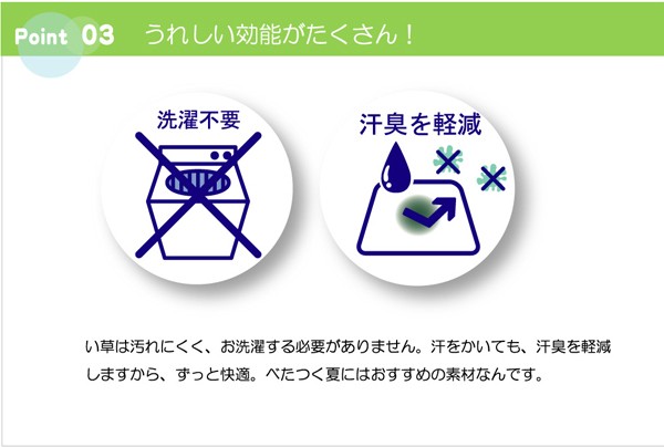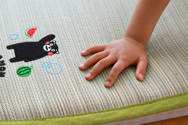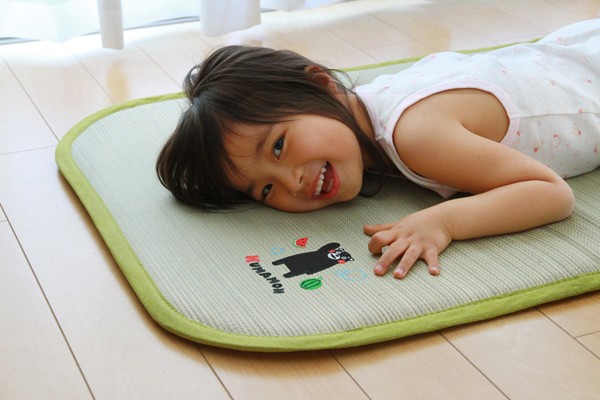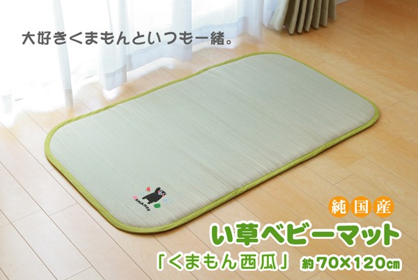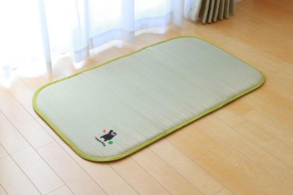 大人気キャラクターくまモンの刺繍がかわいらしいい草ベビーマットです。い草には1.綿の3倍の吸湿性があり汗のじめじめを軽減します。2.湿度の調整作用があり、蒸れにくく快適な就寝を促します。3.汗のにおいの元となる化学物質を90%以上抑え、においを軽減します。などの効果があります。中材にはクッション性にこだわり固わた15mmを使用していますので程良い弾力性があり、フローリングでも快適にご使用頂けます。青森ヒバ加工を施しています。(抗菌・防臭効果)