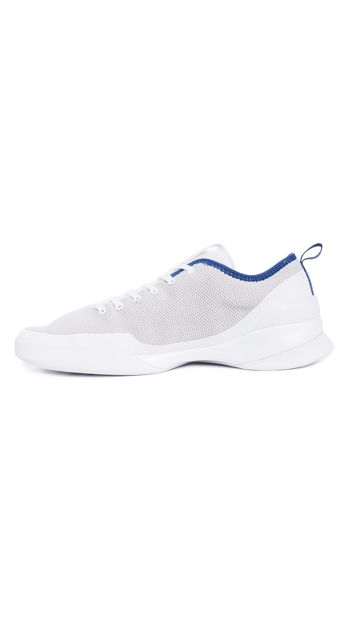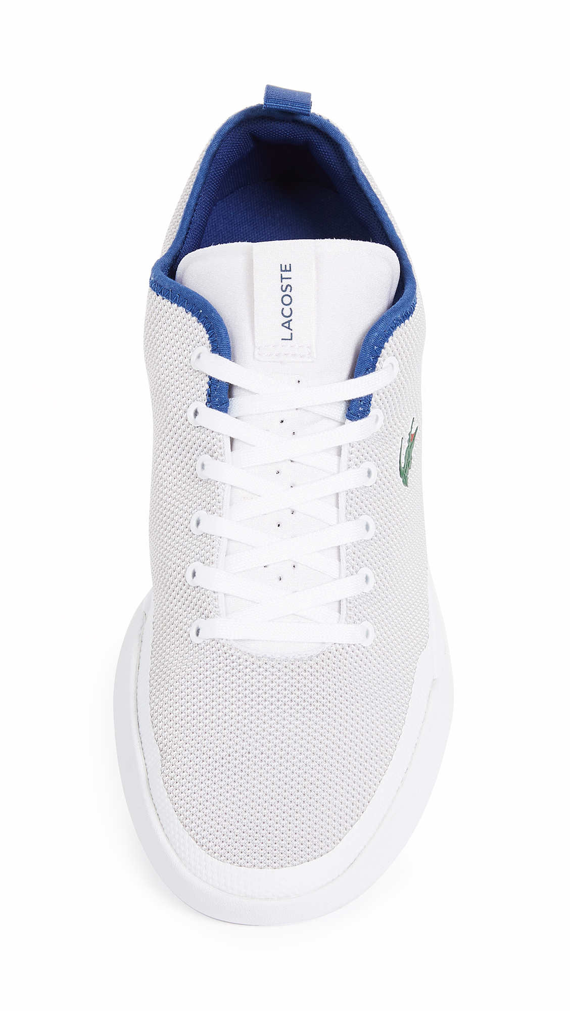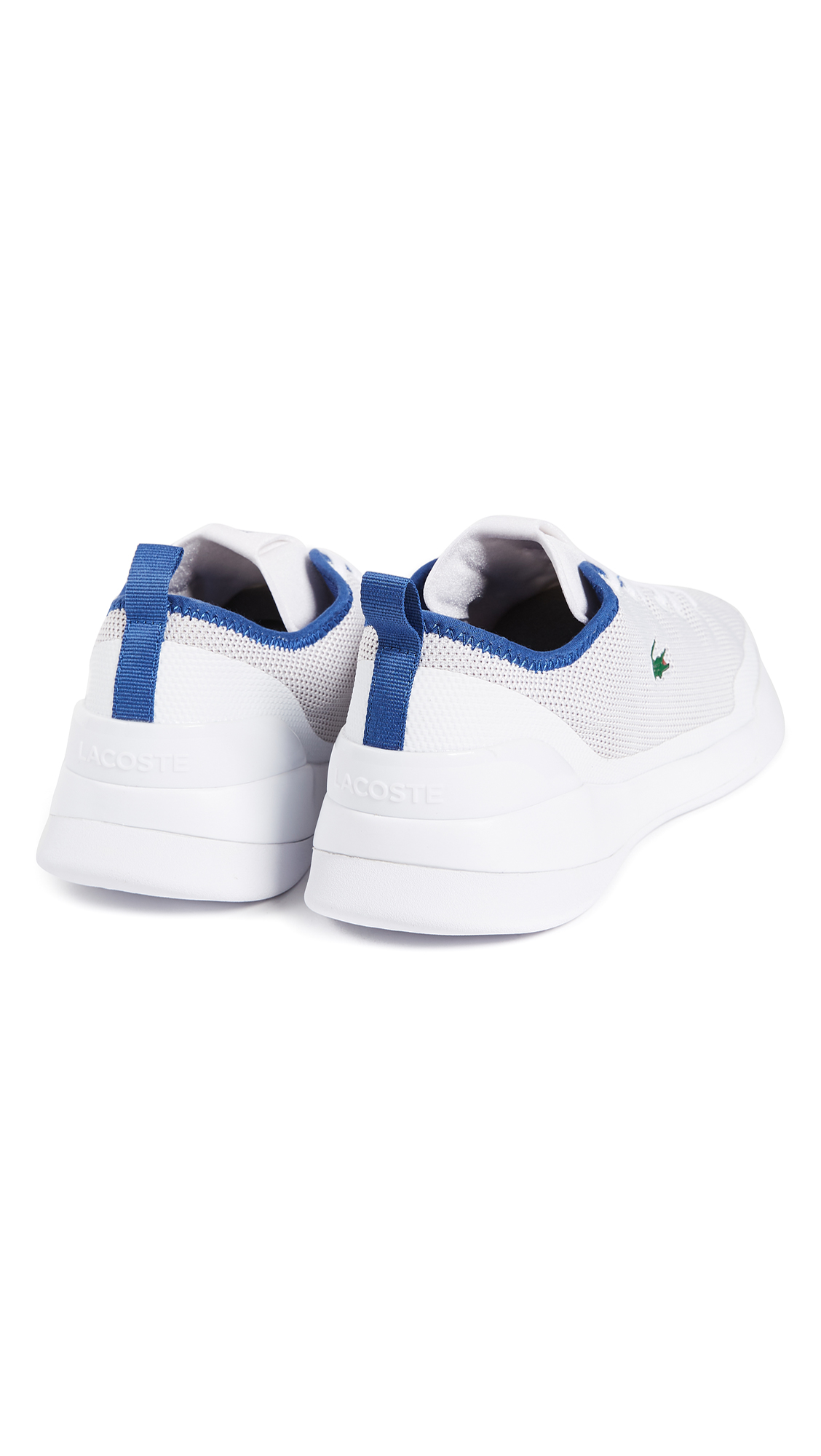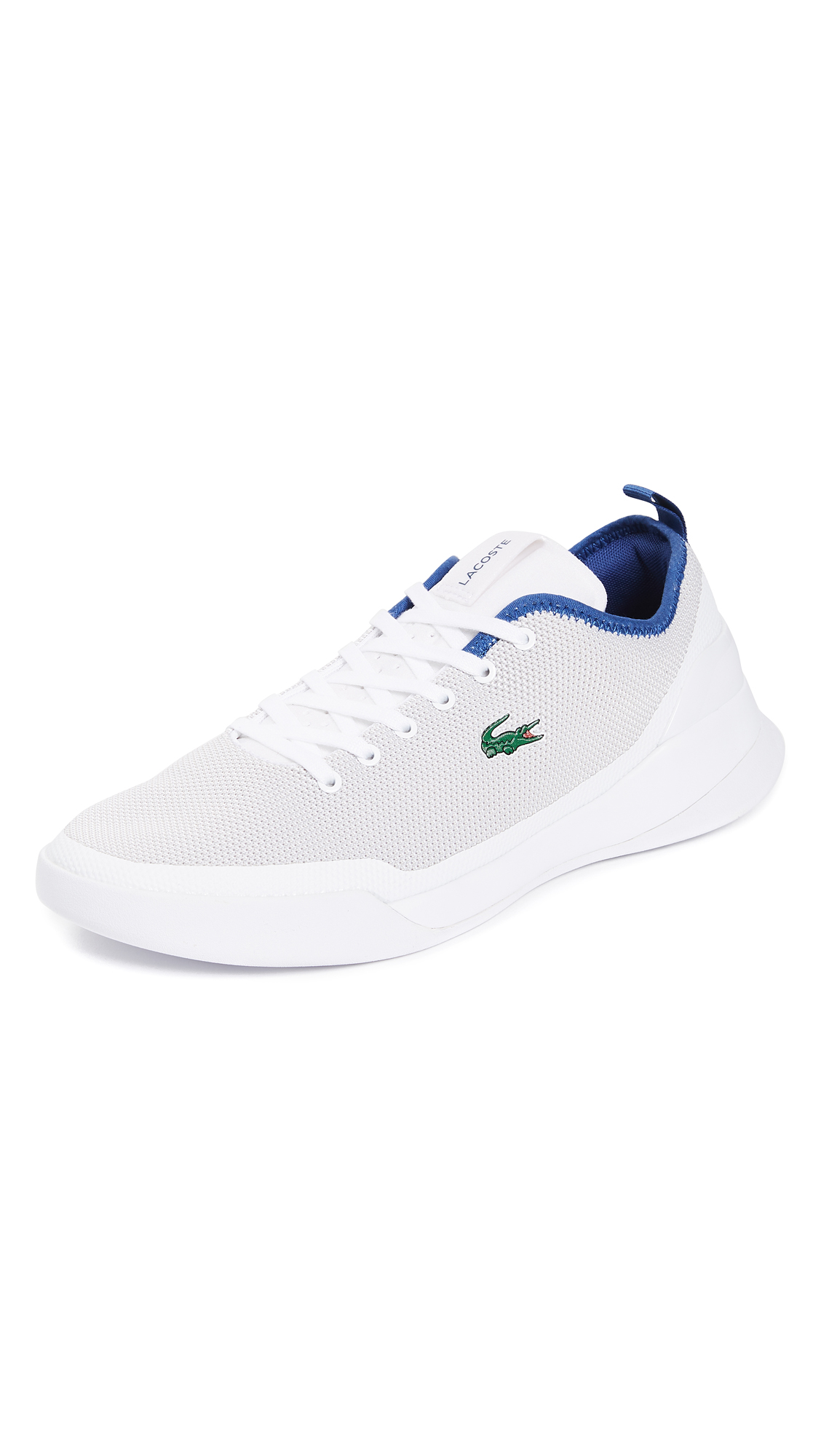 Lightweight Lacoste sneakers with flexible knit uppers. Cushioned heel and laces over the branded tongue. Contrast edges at the cuffs. Cushioned insole and rubber grip sole.
