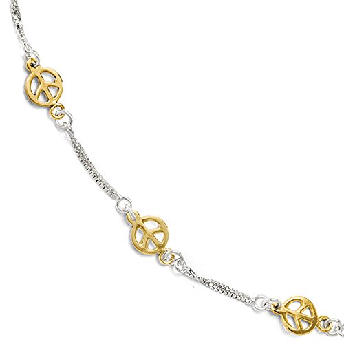 Anklets are a great way to add fun, flash and a feminine touch to your ensemble. This two-tone design features 7mm peace sign charms stationed between a double stand of 1mm box chains. It is fashioned from sterling silver and 18k yellow gold plating, closes with a fancy lobster clasp and adjusts in length from 9 to 10 inches.Feature
