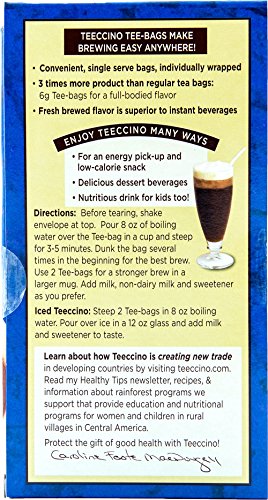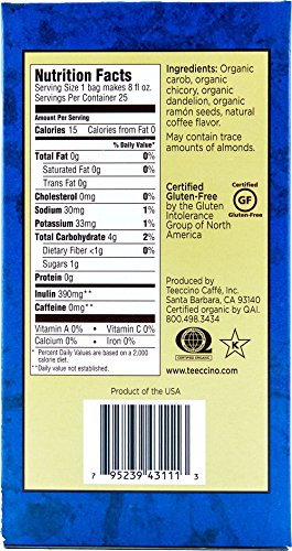 Studio : Teeccino Publisher : Teeccino Binding : Misc. Product Description Deep roasted body with pure coffee notes from dandelion roots and ramon seeds. A background of bitterness from dandelion roots help stimulate detoxification. Teeccino's dandelion flavors are the only brand of coffee alternatives that are certified gluten free and 100% grain free. Teeccino's 6g tea bags have 3 times the ingredients of standard tea bags to produce the richness you expect from of a cup of coffee with all the convenience of steeping it like tea. Whether you're a tea or coffee drinker, you'll love Teeccino's satisfying, robust flavor that fans describe as smoother, richer and creamier than coffee. The secret? French chicory, the roasted root often added to coffee, blended with dandelion root, the renowned detox herb, and Spanish carob, famed for its chocolaty flavor. Enriched with ramon seeds, a traditional Mayan roasted beverage, Teeccino make a delicious cup of tea...or is it coffee? We'll let you decide! 0