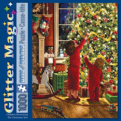 Studio : Melville Direct Publisher : Melville Direct Binding : Toy Product Description Children Decorating the Christmas Tree is a 1000 Piece Glitter Puzzle Designed by artist Liz Goodrick Dillon. Two children in pajamas decorate a Christmas tree with lights and ornaments. There is a mantel where stockings hang and the room is filled with toys like a rocking horse and train set. This puzzle is 20" x 27" when completed. Since the 16th century, jigsaw puzzles have been a favorite pastime for all ages. Now, with technological advances, Bits And Pieces has taken jigsaw puzzles to a new level of superior quality and challenging fun. Every original Bits And Pieces jigsaw puzzle is made with ultra-heavy weight board and cut with quality random puzzle dies with fully interlocking pieces for a secure fit. At Bits And pieces, we believe that every truly exceptional jigsaw puzzle starts with the work of a truly exceptional artist. We understand what it takes to make a great puzzle. The kind that challenges rather than frustrates, where each area has depth and detail that unfold into a larger beauty. Bits and Pieces commissions original artwork by artists from around the world to create imaginative artwork that puzzlers like you are looking for in a wide variety of puzzle sizes and styles for any age or ability. We know every puzzler is different, so every Bits And Pieces original puzzle is manufactured in two different piece counts, ranging from 100 pieces to 2000 pieces. We also have an innovative collection of specialty puzzles including glow-in-the-dark puzzles, glitter effects puzzles, unique shaped puzzles and puzzles with oversized pieces. This 1000 Piece Glitter Puzzle was created by the artist Liz Goodrick Dillon. 0