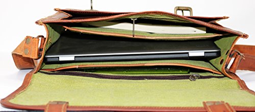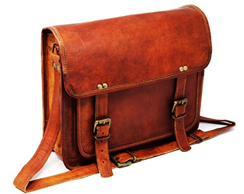 -. Feature : HIGH QUALITY. Old school yet very stylish 100% genuine leather laptop messeneger bag for your valueable laptop. / The bag is : 25 cm X 33 cm x 10cm (10" x 13" x 4" , height,width , depth) that can very well accomodate a 13" Laptop / The bag has 3 interior compartments, the middle compartment is well padded to ensure safety of laptop. In the inside is one full sized zippered pocket to keep documents etc. The bag is big enough to accomodate a laptop and a few books along with charger etc. / There is one pocket in the front exterior that can easily hold passport, Phone, small notepad etc. The main closure is real buckles that are very easy to operate once you get use to them in a week or so. / The bag has an adjustable wide shoulder strap. The strap is wide enough to comfartably carry the bag even when heavy.