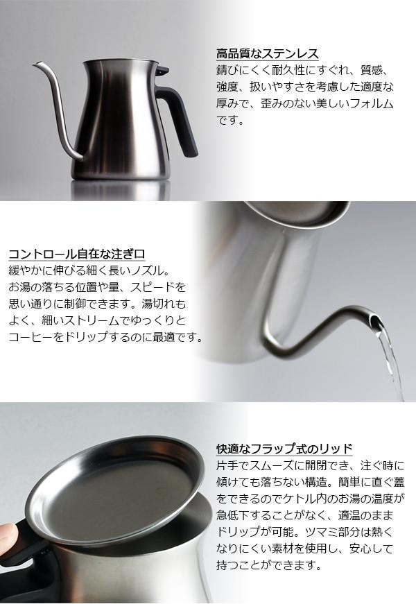 コーヒーをドリップする際に湯の落ちる位置や量をコントロールしやすい注ぎ口、傾けても落ちないフラップ式の蓋、指にフィットして長時間使用しても疲れにくいハンドル、洗いやすさなど、使い心地を追求し使用する上でのストレスを最小限に抑えました。安定感があり場所をとらないコンパクトなフォルムで、主張しすぎないシンプルな佇まいが静かな存在感を放ちます。 |