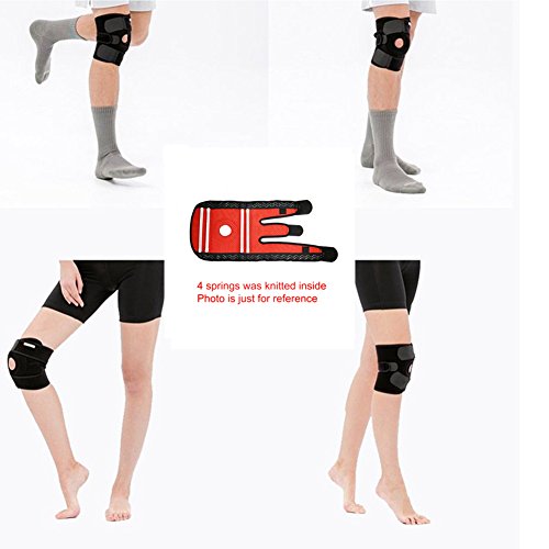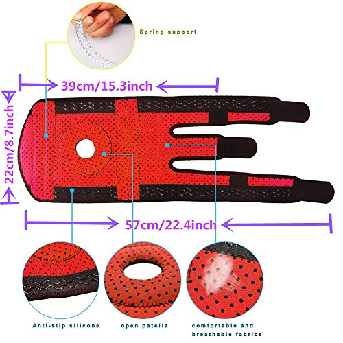 -. Feature : ★ OPEN PATELLA design that will reduce the pressure on the knee without compromising the compression supplied to the muscle area. ONE SIZE FITS MOST (up to 22" above knee circumference) with Unique fasteners to ensure a tight fit and an easy fix. / ★ REINFORCED STABILIZER RING ensures the knee cap remains in its proper position, and distributes stress across the ACL, PCL, LCL, and MCL ligaments, lowering the risk of re-injury by guiding the knee cap into proper motion. / ★ BREATHABLE NEOPRENE wraparound knee support brace with moisture-wicking ability, which is a good choice for workout. Neoprene is a high quality material, ideal for compression sleeves and braces, because it is extremely lightweight, breathable and flexible and it provides maximum comfort and ease of movements! / ★ DESIGNED FOR ATHLETES, IDEAL FOR ANYONE - Our best knee brace with flexi-metal coils for increased knee support and performance was designed for high-volume use by athletes, but it's ideal for anyone! / ★ BEST CHOICE- with the help of twin strings for LATERAL SUPPORT and greater shock absobtion. Great use in SPORTS like Football, Basketball, Volleyball, Tennis, Wrestling, CrossFit, Golf, Bowling, Fencing, Bicycle Riding, and Soccer. Also it's the best choice for people that go to Gym, Fitness programs and also for Runners.