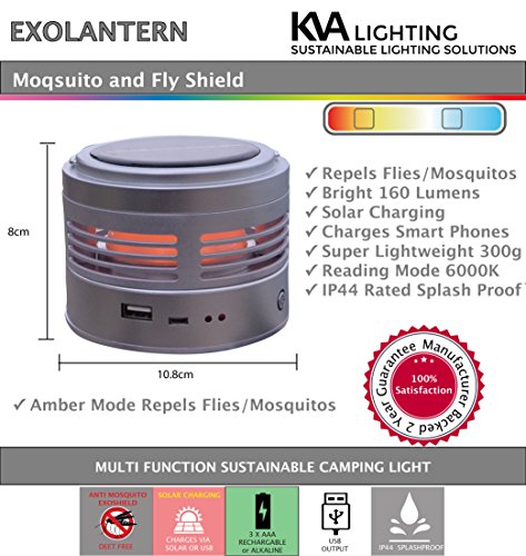 -. Binding : Misc. -. Brand : KVA LIGHTING -. Feature : DEET FREE PROTECTION: This lantern put out a 2m protection EXO Shielding zone that stops mosquitos, flies, and various other bugs flying anywhere near you. / UTLRA PORTABLE: The camping light is ultra light weight robust and collapses down for easy storage. Light weight and small at 108*105*105mm. This 2W 160 Lumen output light is 10X the average brightness of cheaper lights that put out a measly 15 lumens. / CHARGE ANY USB DEVICE: This lamp charges any USB device on the go including phones and mp3 player. If you simple need more juice just bring a spare pack of batteries and pop into the lamp. For more environmentally friendly usage we recommend you use rechargeable batteries. / SOLAR CHARGING: The onboard solar panel mean if you are camping or trekking for days you can charge your camping light no matter where you are. Bring and extra set of stand rechargeable batteries and you could camp in the rain forrest for days without worrying about bugs or lack of light. / WATER and DUST PROOF: IP44 Rating mean our product is truly water resistant. Pour water on our product or get rained on heavily without worry. (Not it's not designed for full submersion). Dust proof and super splash means you'll enjoy this light for years. Comes with a 2 Year manufacturer back warranty for faults and defects. -. IsAutographed : 0 -. IsMemorabilia : 0 -. Label : KVA LIGHTING -. Manufacturer : KVA LIGHTING -. ProductGroup : Sports -. ProductTypeName : SPORTING_GOODS -. Publisher : KVA LIGHTING -. Studio : KVA LIGHTING -. Title : EXO LANTERN - Ultra-light Solar Camping Light - Repels Mosquitos and Flies. Compliments Mosquito Nets, Reduces The Amount Of (DEET) Mosquito Spray. Runs on 3 x Rechargeable AAA