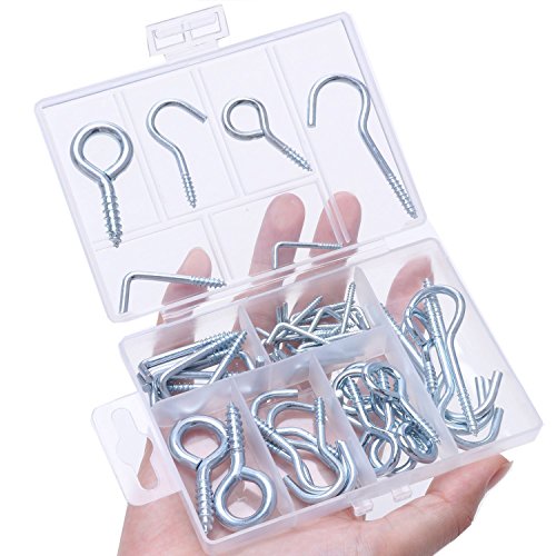 A nice variety and quantity assortment of hooks and eyes. Great to keep in a tool box. It seems there are a lot more hooks in there than what the photo shows.You can plan to put some of the larger hooks up on a wall and hang hats and jackets on them. Also one of the smaller sized hooks is the perfect size to mount up a flexible tube light against a wall under a shelf.