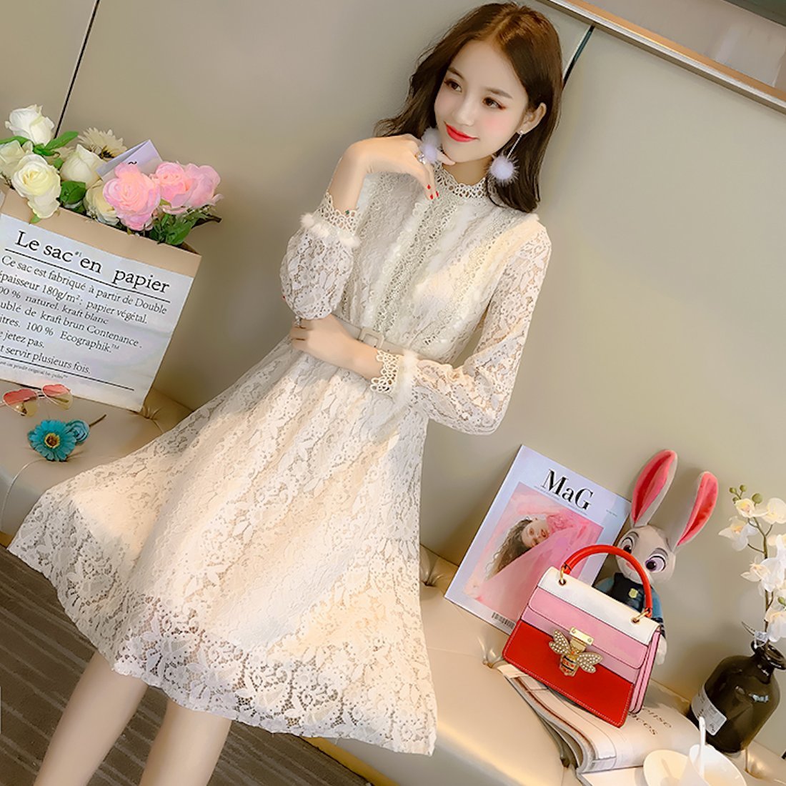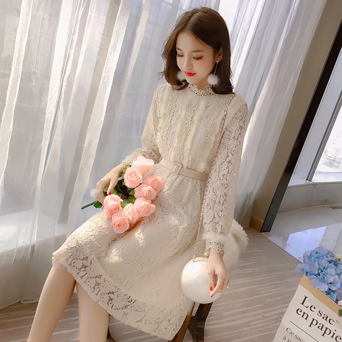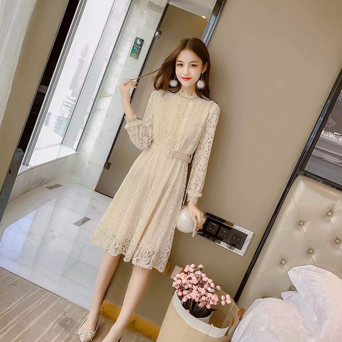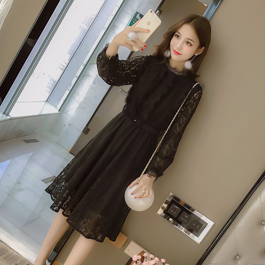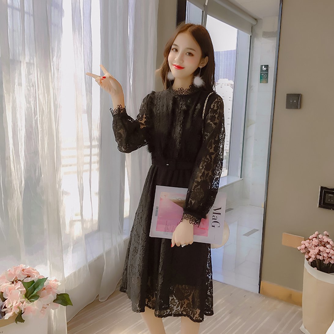 ハイネックの花柄レースがレトロな雰囲気のベルト付きワンピースドレス。