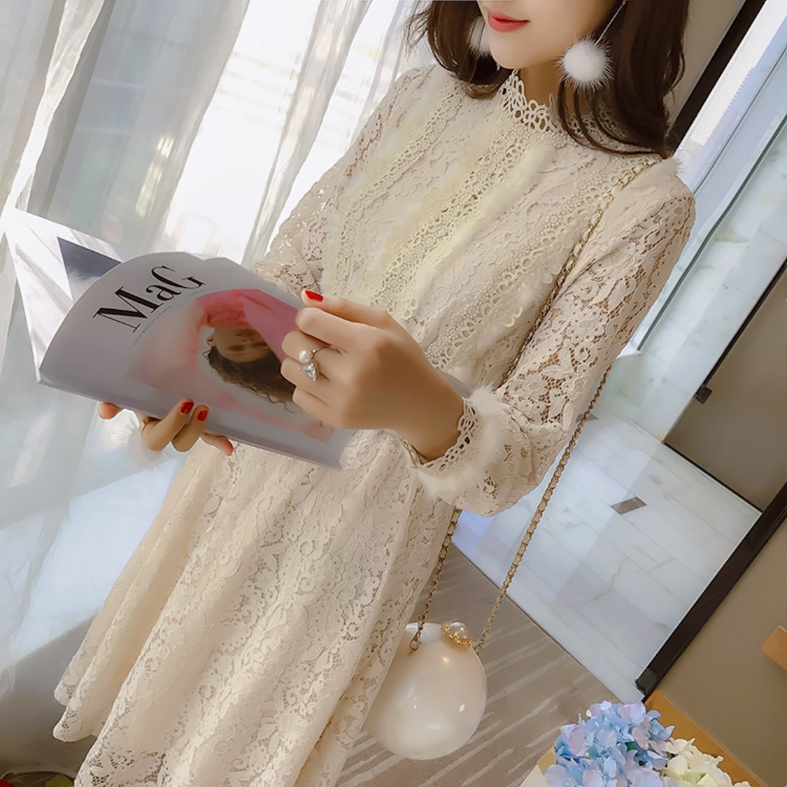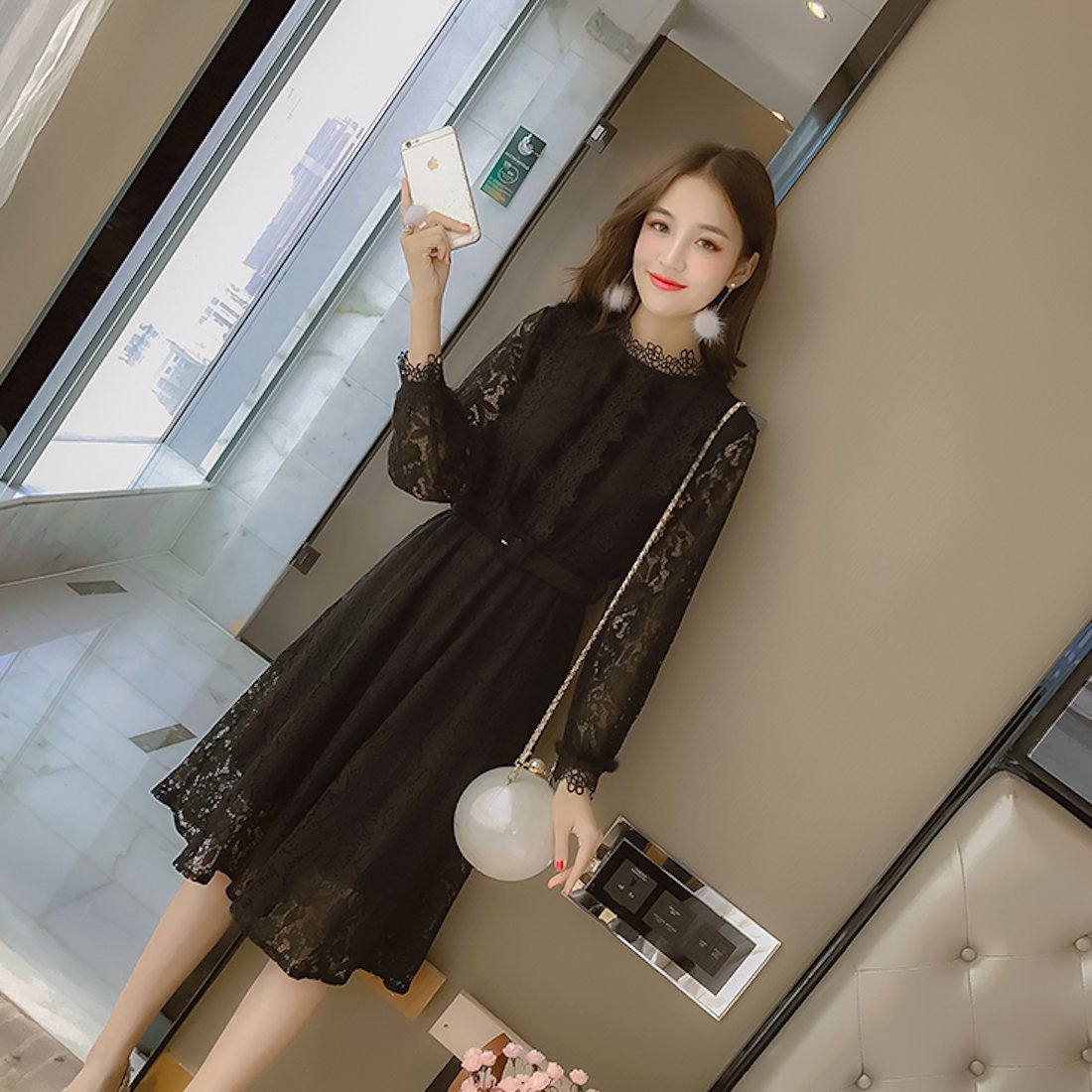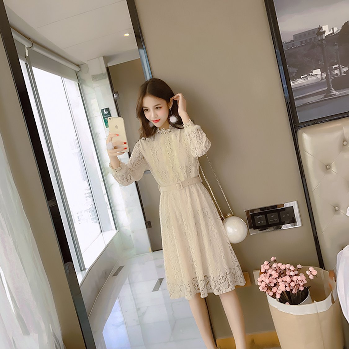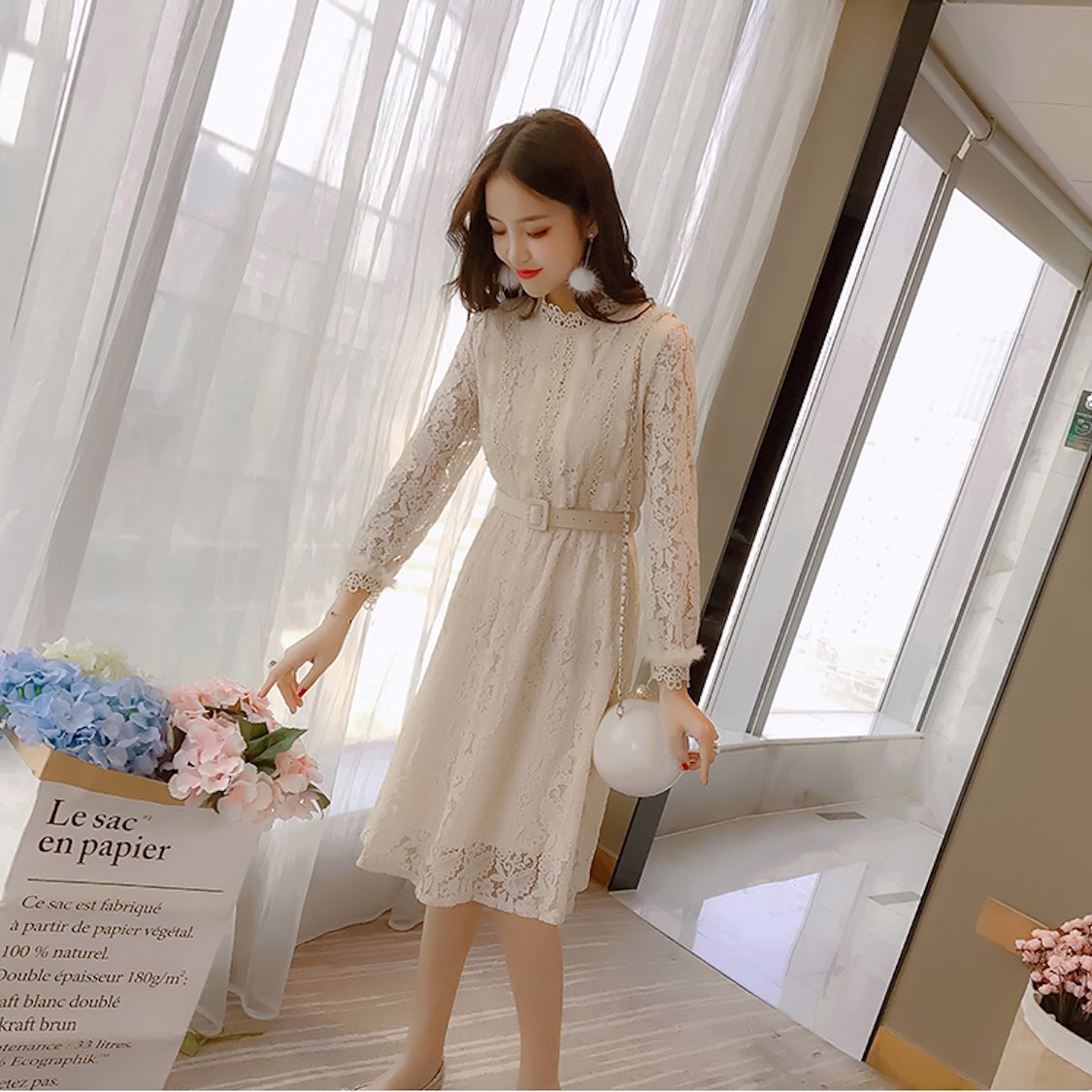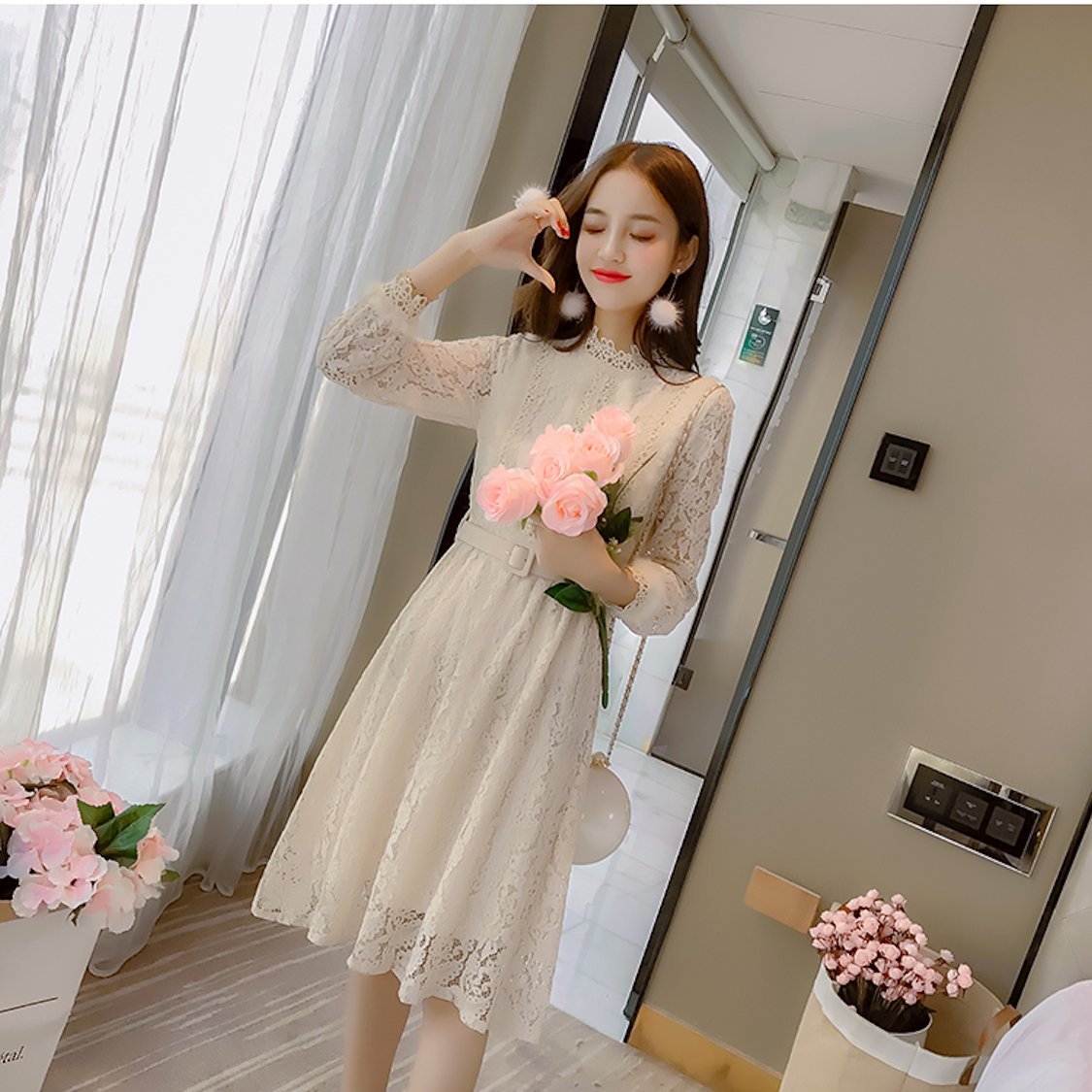 ハイネックの花柄レースがレトロな雰囲気のベルト付きワンピースドレス。