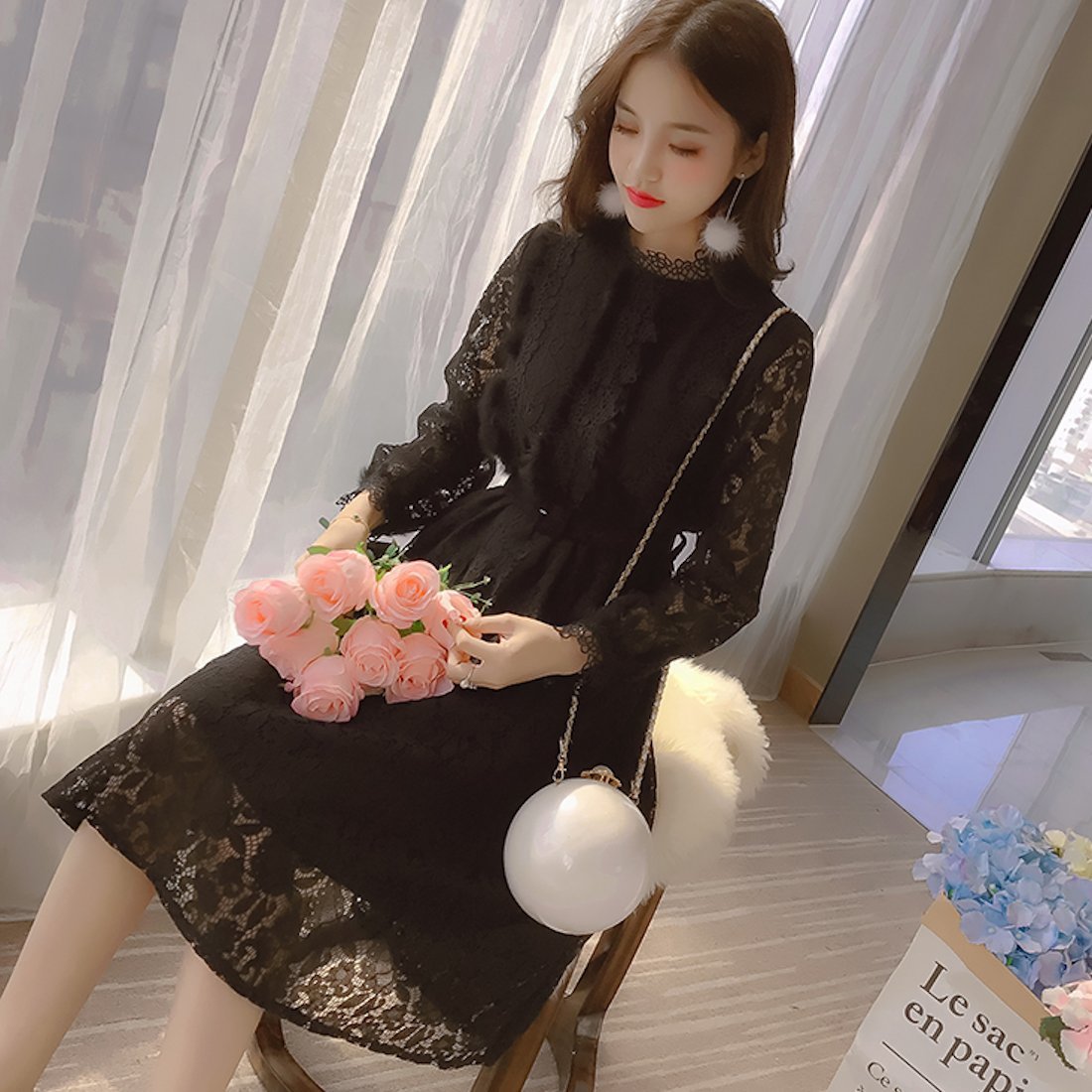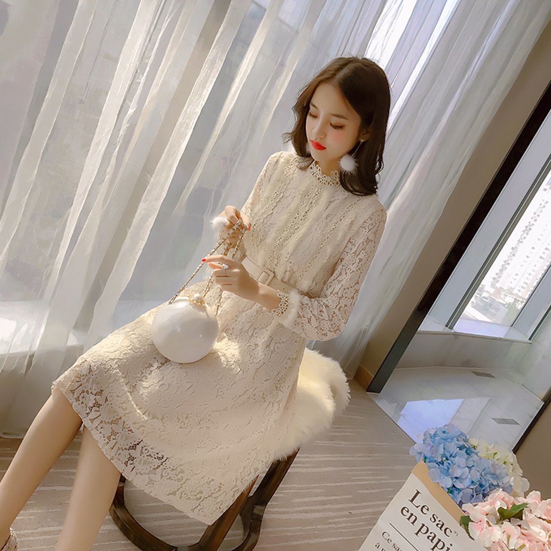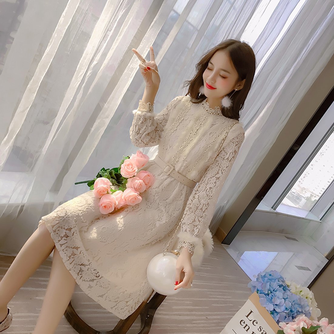 大人フェミニン♪ 花柄 総レース ワンピース ファー レトロ ベルト付き シフォン 透け感 ハイネック きれいめ お呼ばれ 結婚式 二次会 秋冬