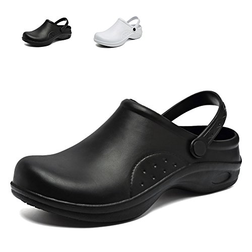 -. Feature : SLIP RESISTANT SOLES: Designed with slip resistant and durable rubber soles allow you walk around polished floor safely / STURDY ENCLOSED TOE CAP: Enclosed design and extra-dense EVA toe cap offer extra protection and with thicker metatarsal area protect your foot from hurts and kitchen spills / LIGHWEIGHT AND COMFY: The work clogs designed specifically for those who in the restaurant, food service, hospital,clinic and health care industries,Educators and support wear long hours on their foot / BREATHABLE INSOLE: Comfort, non slip , breathable and foot bed designed promised you wear comfy and keep dry / MULTIFUNCTIONAL CLOGS: Perfect for all occasions -- indoor home ,outdoor, medical, garden lake, kitchen, walking,clinic,hospital,beach,work wet place and others