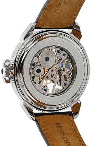 -. Feature : Precise 17 jewels mechanical Chinese movement / Black and silver skeletonized dial with blue, red and white hands, silver tone hour markers and Arabic numerals; luminous; sapphitek crystal; stainless steel case; black leather strap / Mechanical-hand-wind Movement / Case Diameter: 45mm / Water Resistant To 99 Feet