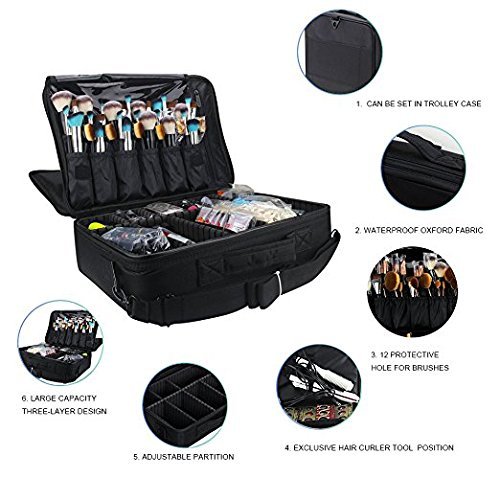 6 Elastic for hair curler hair straightener , makeup brush etc . zippered mesh bag . 12 Elastic pocket with a plastic cover give all your brushes a safe "home". multi movable Partition give your freendom to arrange the space.