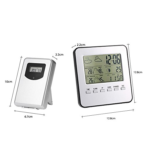 -. Feature : Display the date, time and measure indoor and outdoor temperature and humidity. / RF receiving function, you can know outdoor temperature and humidity with indoor receiver. / Accept 3 different RF symbols at the same time(usually our product includes 1pc receiver + 1pc transmitter). / Weather forecast: sunny, slightly cloudy, cloudy and rainy. / Week displays in 7 languages: English, German, French, Italian, Spanish, Dutch, Danish.
