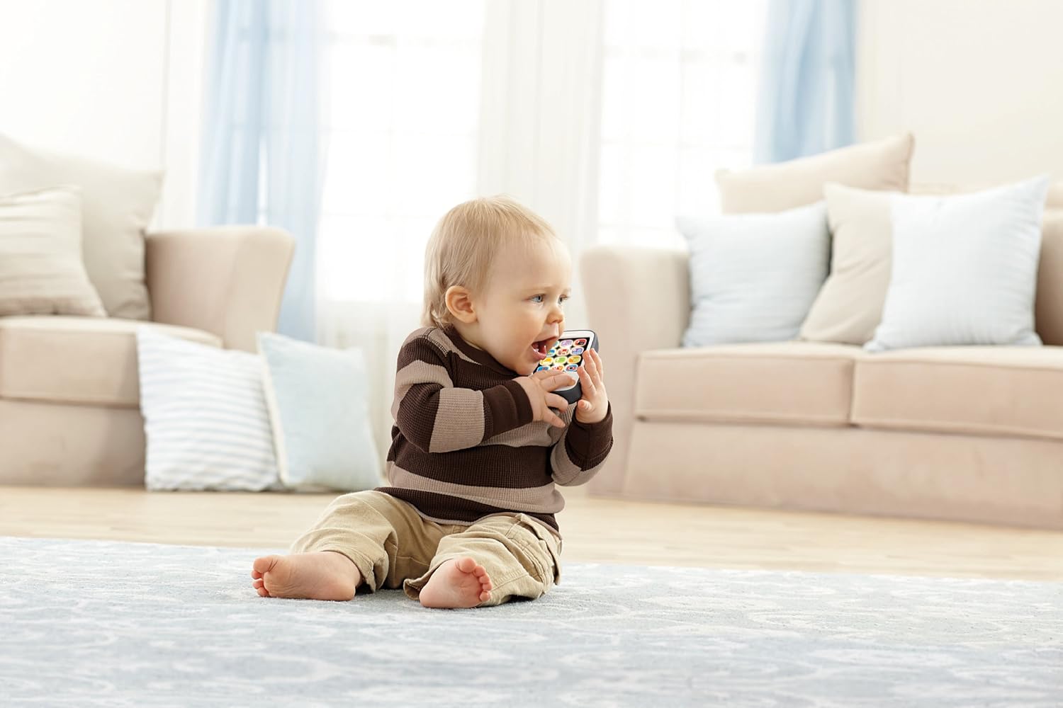 A fresh, sleek phone, just for baby! Press any of the “app” tile buttons to hear more than 20 songs and phrases about numbers, counting, greetings and more. Light dances along to the music. Baby can also move the slider back and forth to activate additional songs and sounds.