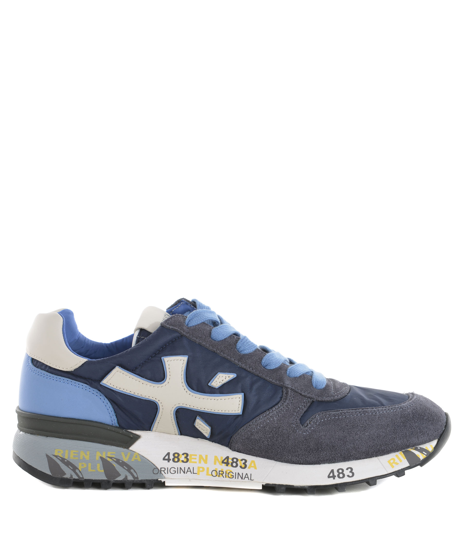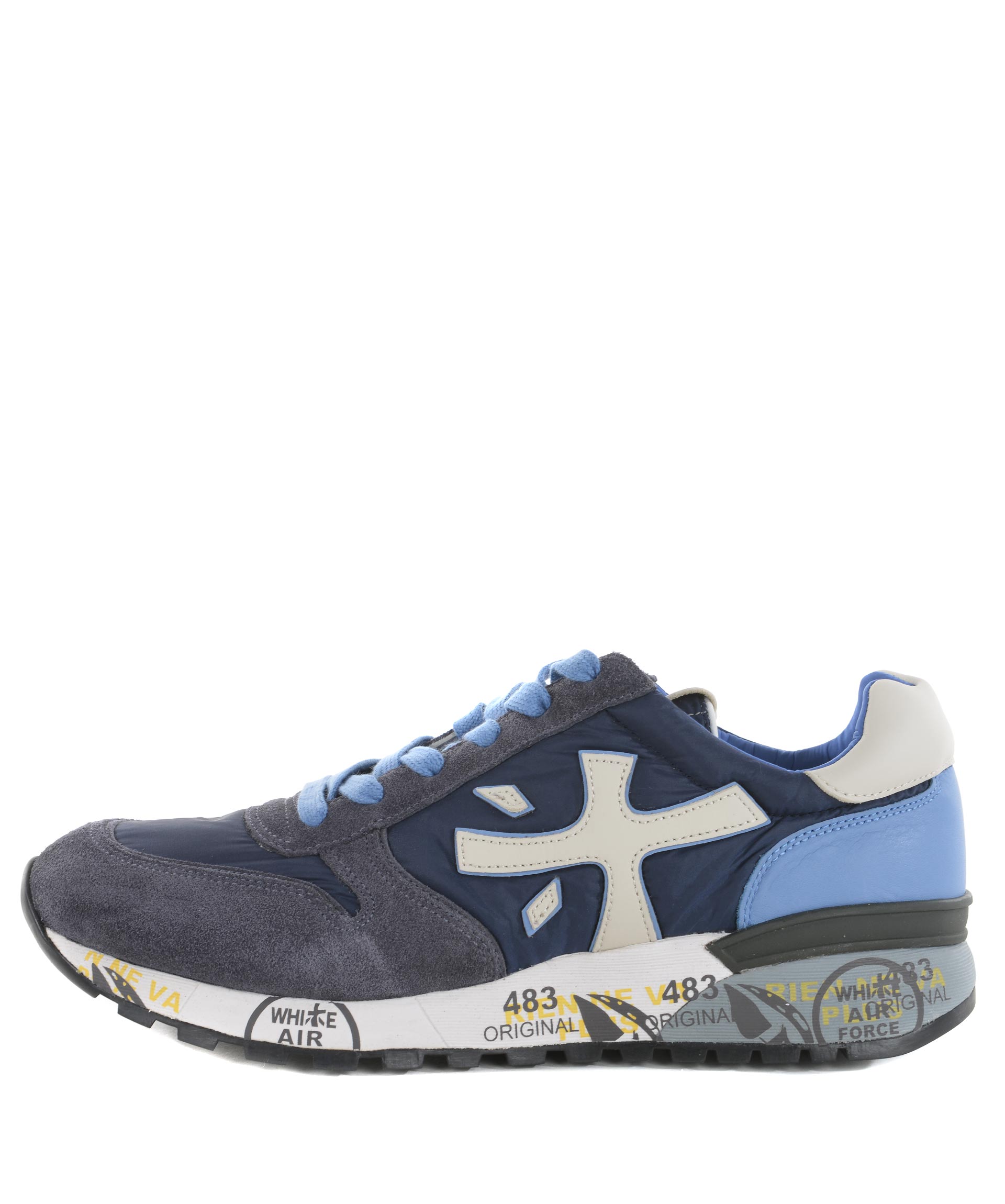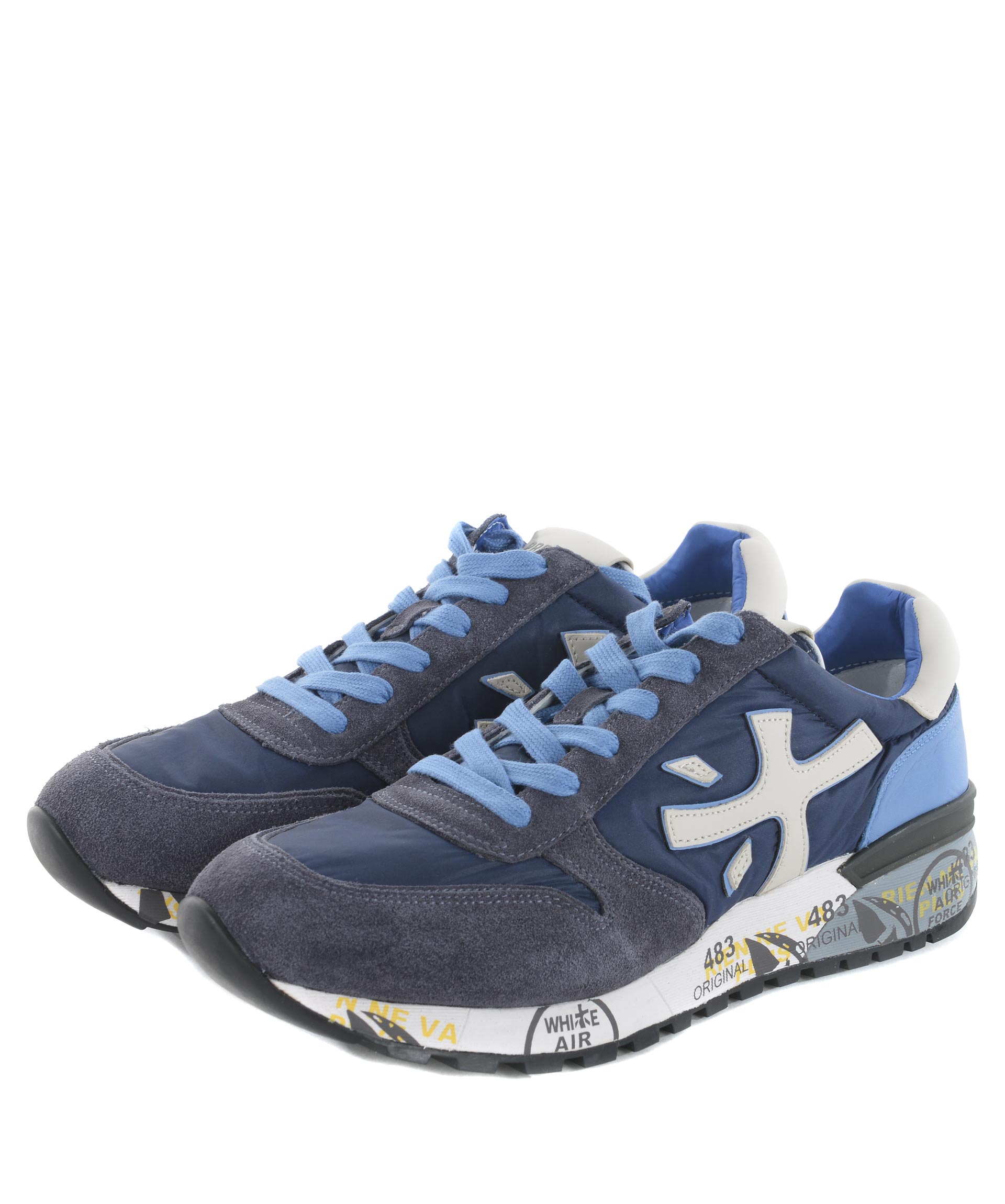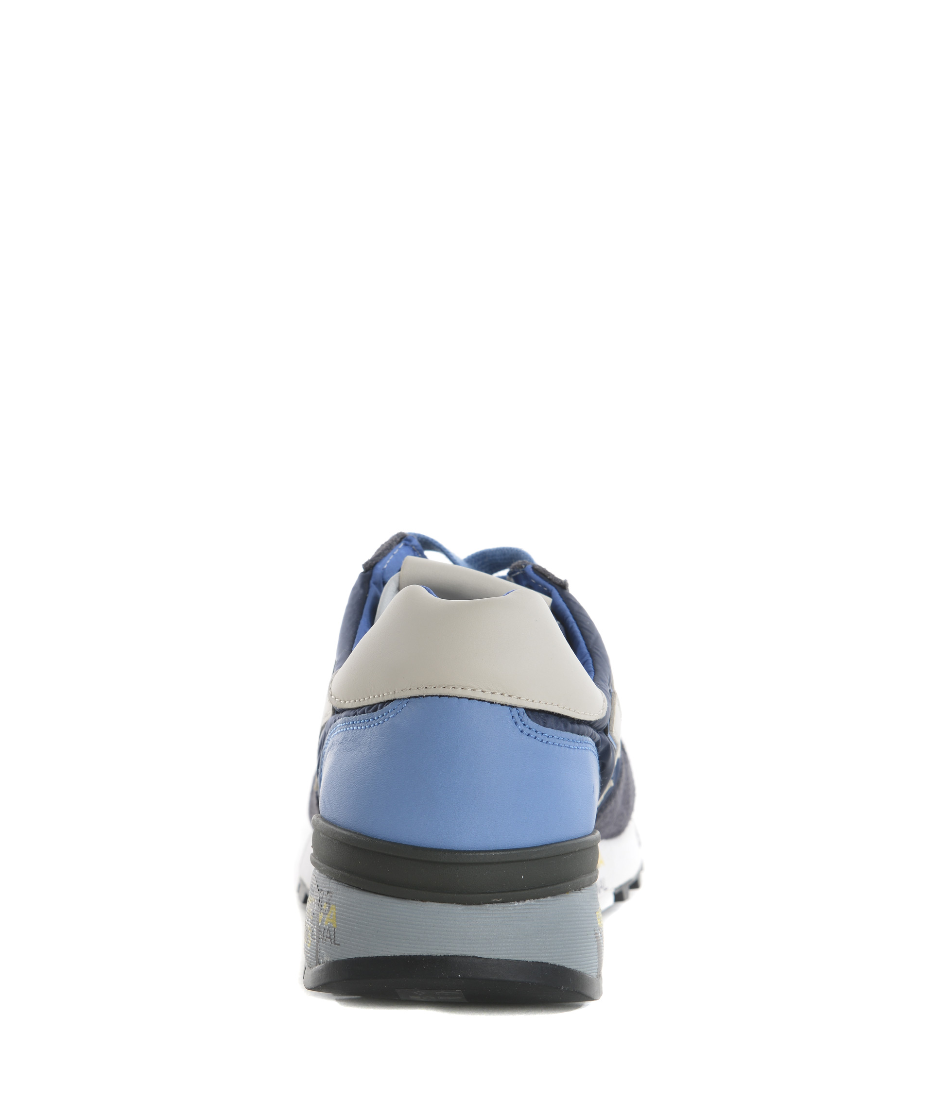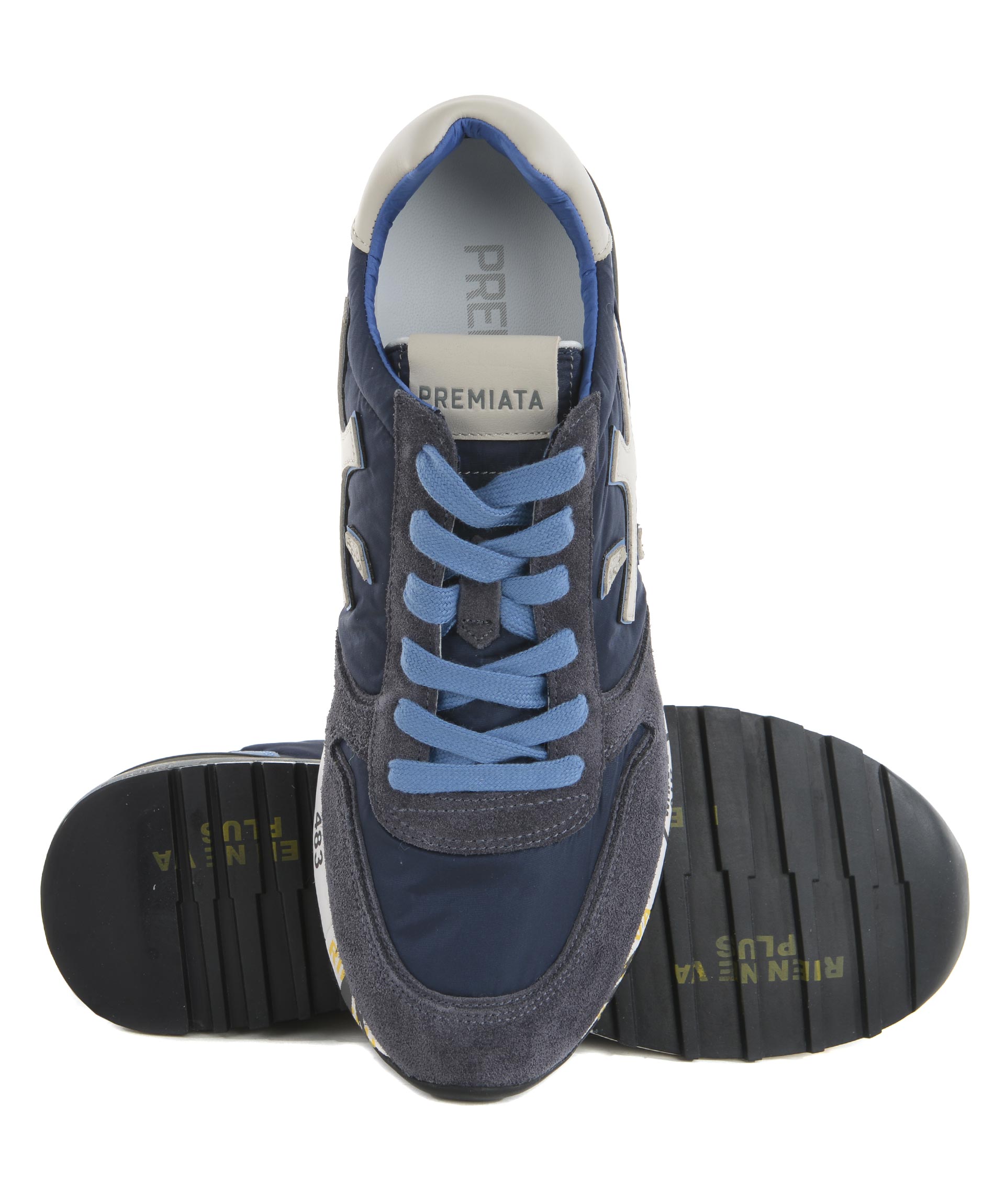 Sneakers uomo Premiata in camoscio e nylon Blu. Inserti in pelle Azzurra. Logo laterale in pelle grigia. Stringate. Suola 40 mm in gomma stampata. Misura in foto 41