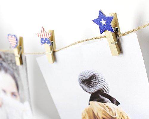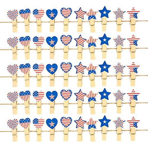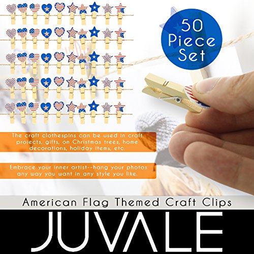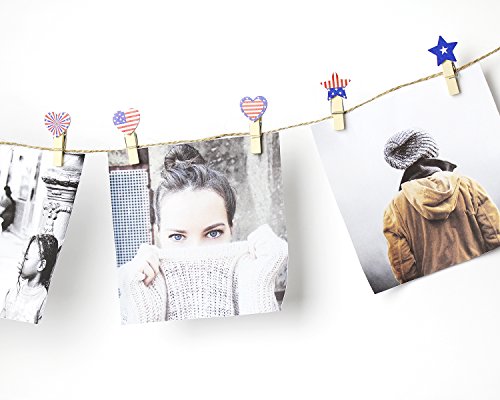 50-Piece Craft Clothespins, Patriotic American Flag Clothespins with Jute Twine | For Arts and Crafts & Decoration, 54 Inches Long
