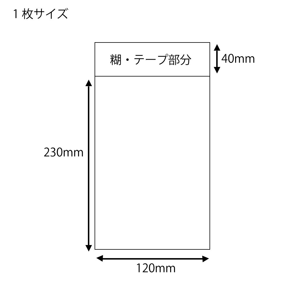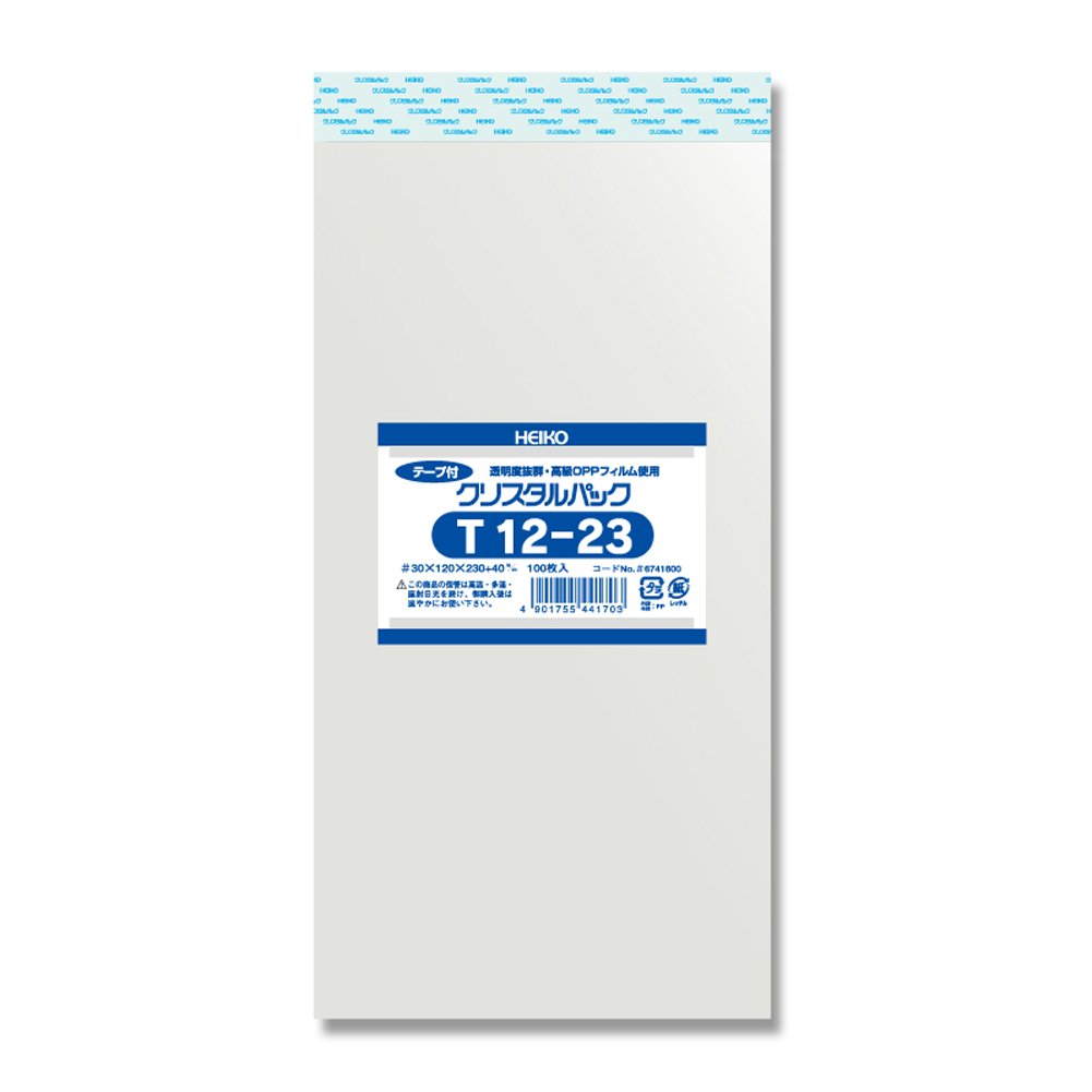 透明度と強度に優れたポリプロピレン製の「クリスタルパック」。 テープ付で封ができるタイプ。たっぷり使える大容量。 【サイズ】幅120×高さ230+テープ部分40mm 【入数】100枚 【材質】OPP0.03mm厚