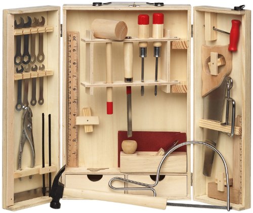 Holzwerkzeugschrank mit umfangreichem Qualitätswerkzeug, speziell für Kinder. Lässt das Bastlerherz höherschlagen. Inhalt: Feinsäge, Fuchsschwanz, Bohrer, Hammer, Holzhammer, Schraubzwinge, Gabel/Ringschlüssel, Schraubenzieher, Stemmeisen, Hobel, Zange, Schleifpapier u.v.m. Größe zusammengeklappt: 24 x 36 x 5 cmFeature