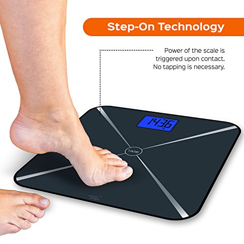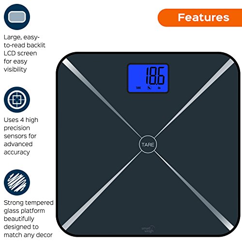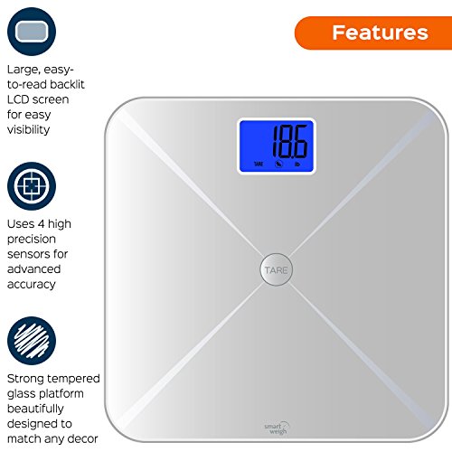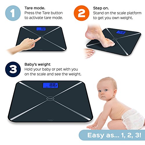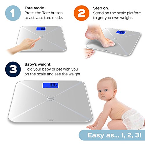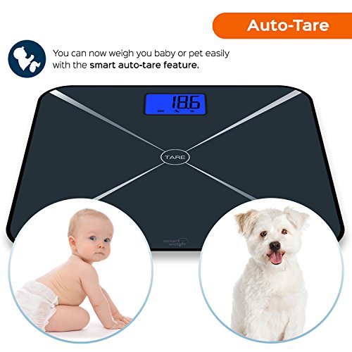 -. Brand : Smart Weigh -. Feature : Smart Technology: Smart Tare bathroom scale has easy tare weighing function to assist with weighing baby or pet, along with three weighing modes: lb, kg and st;lb / High Precision: Four advanced sensors give extremely accurate readings, while auto calibration system ensures consistent, faultless readings each time / Modern Design: Digital scale is designed with a sleek, durable tempered glass platform with a capacity of 440 pounds / 200 kilograms. The large blue backlit LCD display shows readings with large visible numbers / Convenience: Made with advanced step-on technology, this bathroom scale gives weight readings immediately with no tapping necessary, large tare button makes using Smart Tare function easy / Features: Scale comes equipped with energy saving auto shut off and low battery indicator. Includes batteries and two year warranty -. Label : Smart Weigh -. Manufacturer : Smart Weigh -. MPN : STS200 -. PartNumber : STS200 -. ProductGroup : Health and Beauty -. ProductTypeName : PERSONAL_CARE_APPLIANCE -. Publisher : Smart Weigh -. Studio : Smart Weigh -. Title : Smart Weigh Smart Tare Digital Body Weight Bathroom Scale with Large LCD Display and Tempered Glass Platform, 440lbs/200kg Capacity