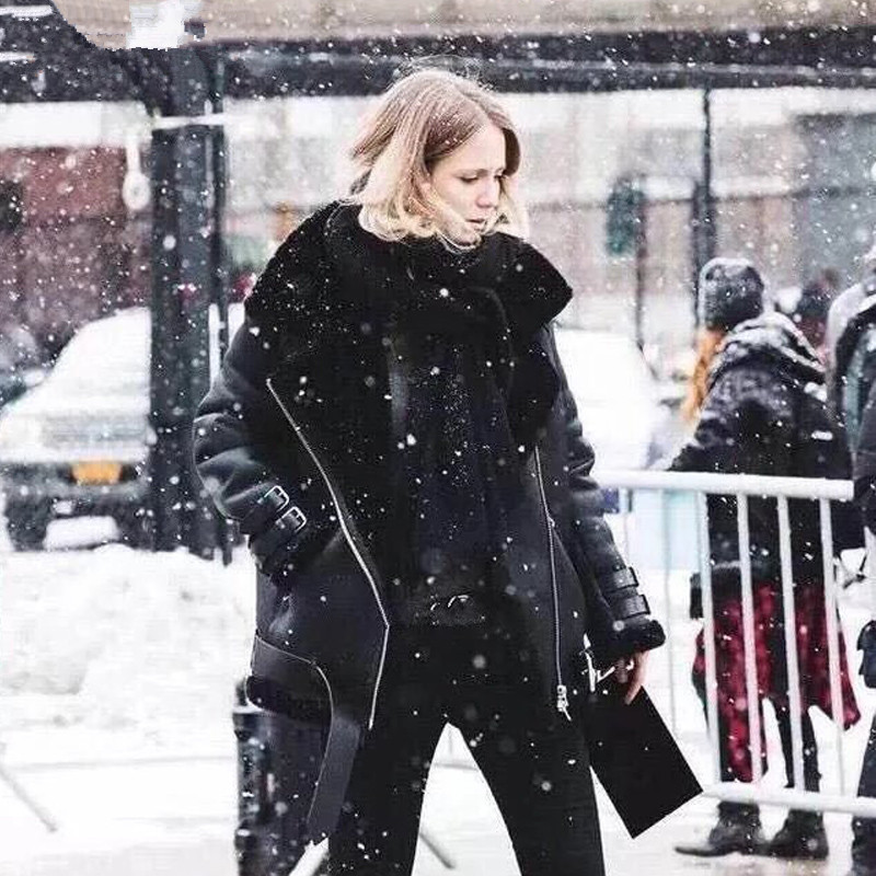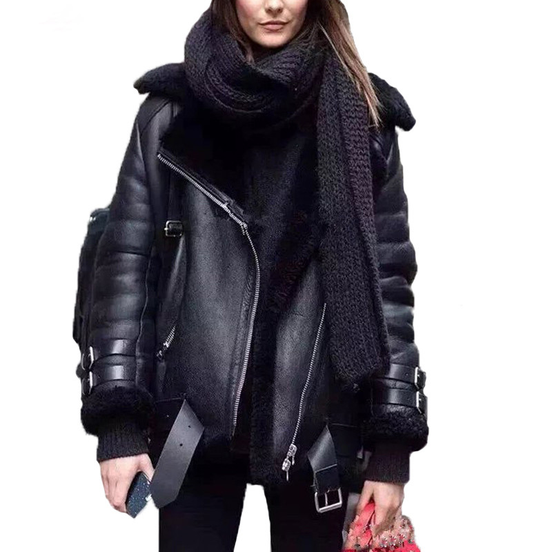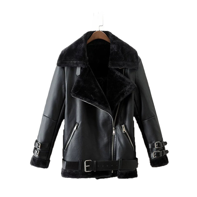 Winter Women Coat Casual Belted Leather Jacket Fur Loose Casual