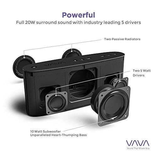 VAVA bluetooth 스피커 서는 20W 강력한 서라운드 사운드 및 하트 비트 저음 서브 우프《―》--2개의 5W드라이버,10W서브 우프《―》와 2개의 passive 라지에타를 탑재하고 있고, 공간 전체를 만족시키는 강력하고 입체적인 음성을 생성합니다.「서라운드」모드에서는,강력한 서브 우프《―》부터 찔리는 저음은,틀림없이 최고의 클래스입니다.