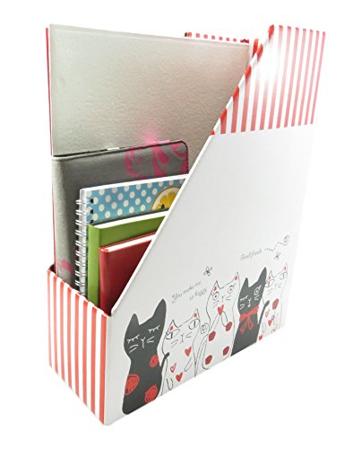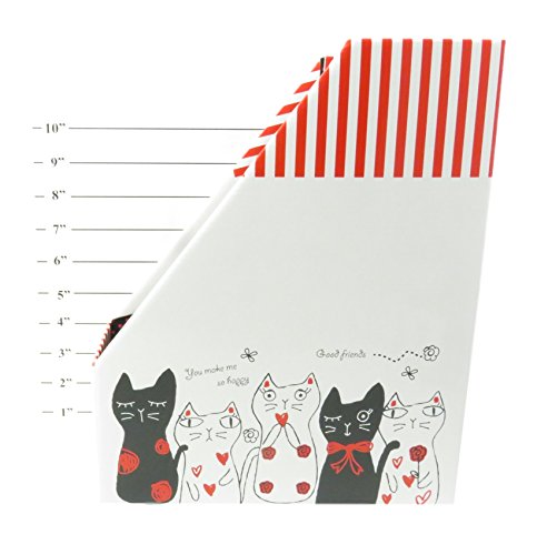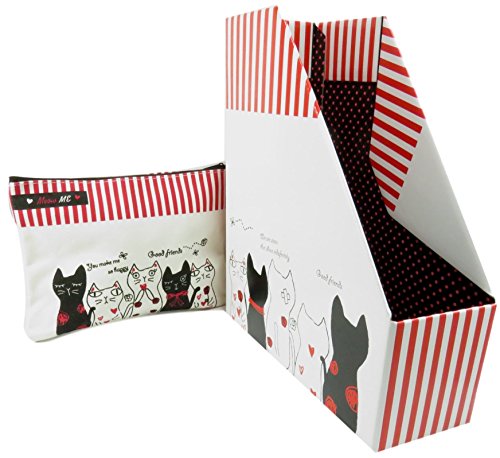 - THE SPECIFICS: Bundle of 2 items: 1 paperboard magazine holder box (12" x 9.75"), and 1 canvas pencil case (9.1” x 6.5”) both in red, white and black with fun cat designs. The journals, notebook, tablet, scissors, tape, and folder are for demonstration purposes only and not included.