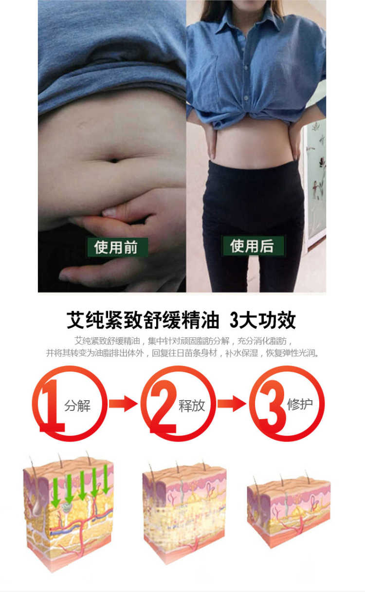 【无需节食 月瘦20斤 懒人必备 绝不反弹】采用纯中药提取精华,促进脂肪燃烧分解,快速排出体内代谢废物和毒素,防止脂肪堆积吸收,促进皮下纤维组织新生,收紧松弛皮肤,令腹部产物恢复紧致有弹性。三瓶一个周期,对久坐型脂肪、先天性、顽固性、遗传型肥胖、暴饮暴食型肥胖和产后型肥胖效果更明显。注:本产品是外用,切忌内服,完全无副作用。使用方法:先用热毛巾热敷使用部位2分钟,让毛孔张开,再涂抹本产品,轻轻按摩直至吸收即可。一天使用两次,早晚各使用一次!