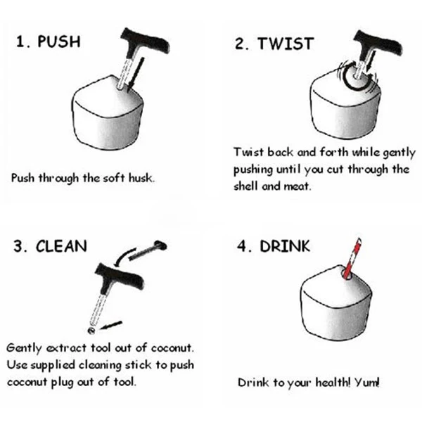 PUSH - Push the tool through the soft husk at the top of the young drinking coconut.