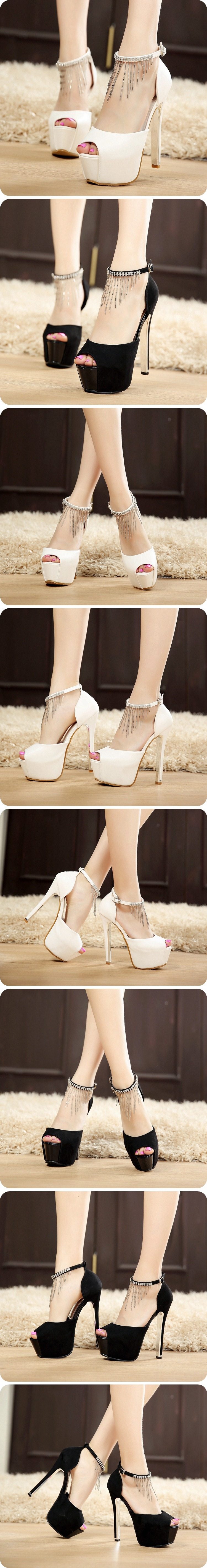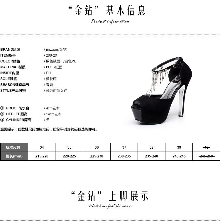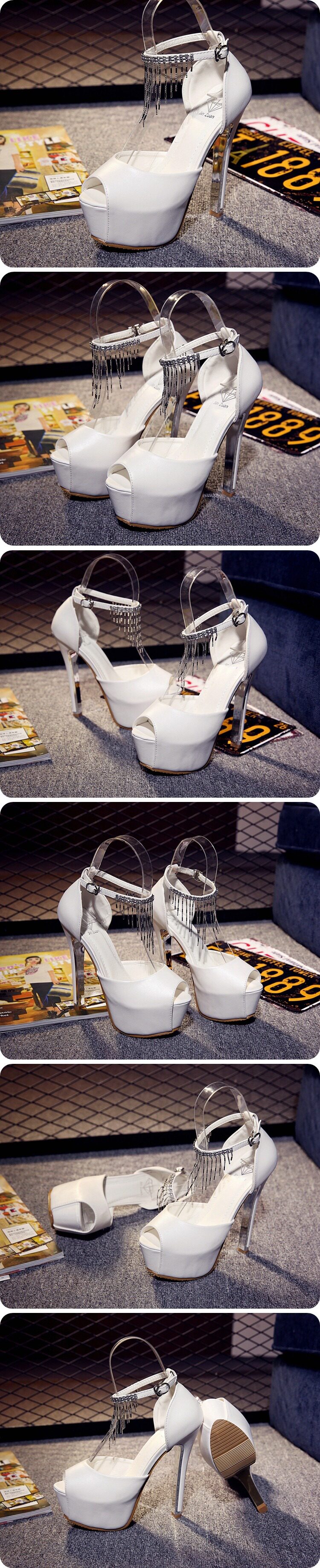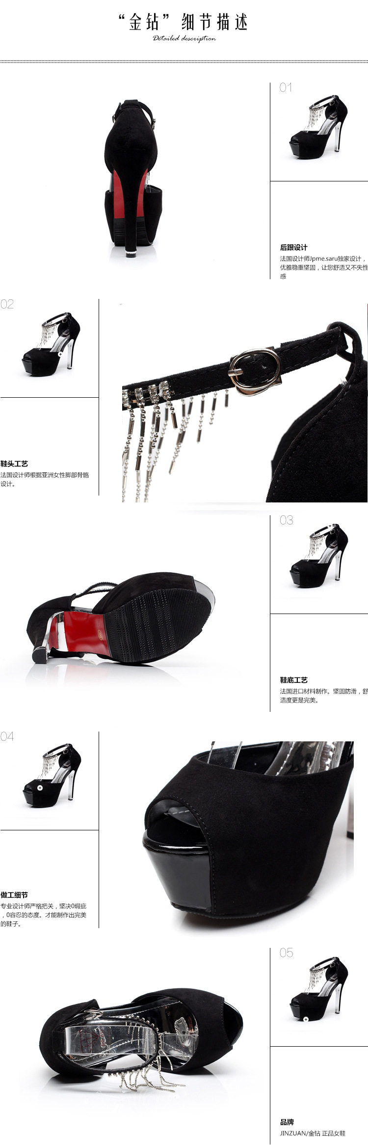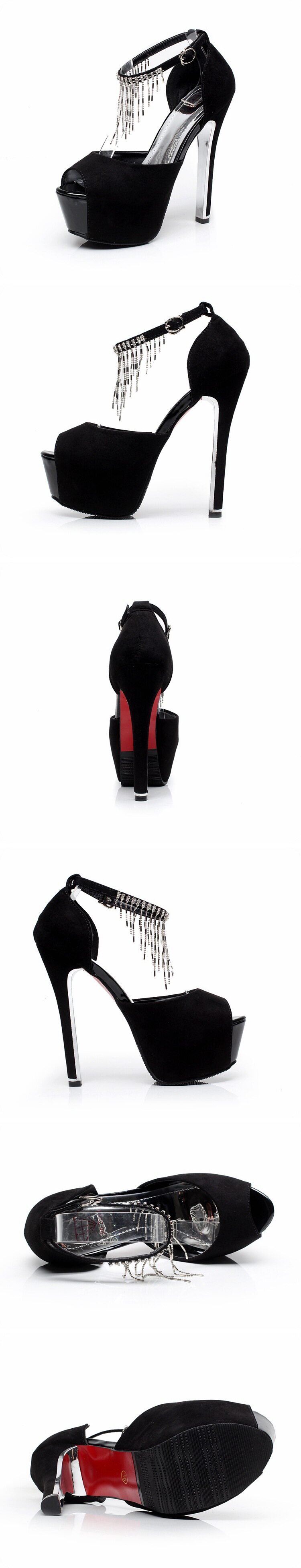 14CM超高跟鞋细跟防水台水钻鱼嘴欧美新款夜店性感流苏扣带凉鞋女