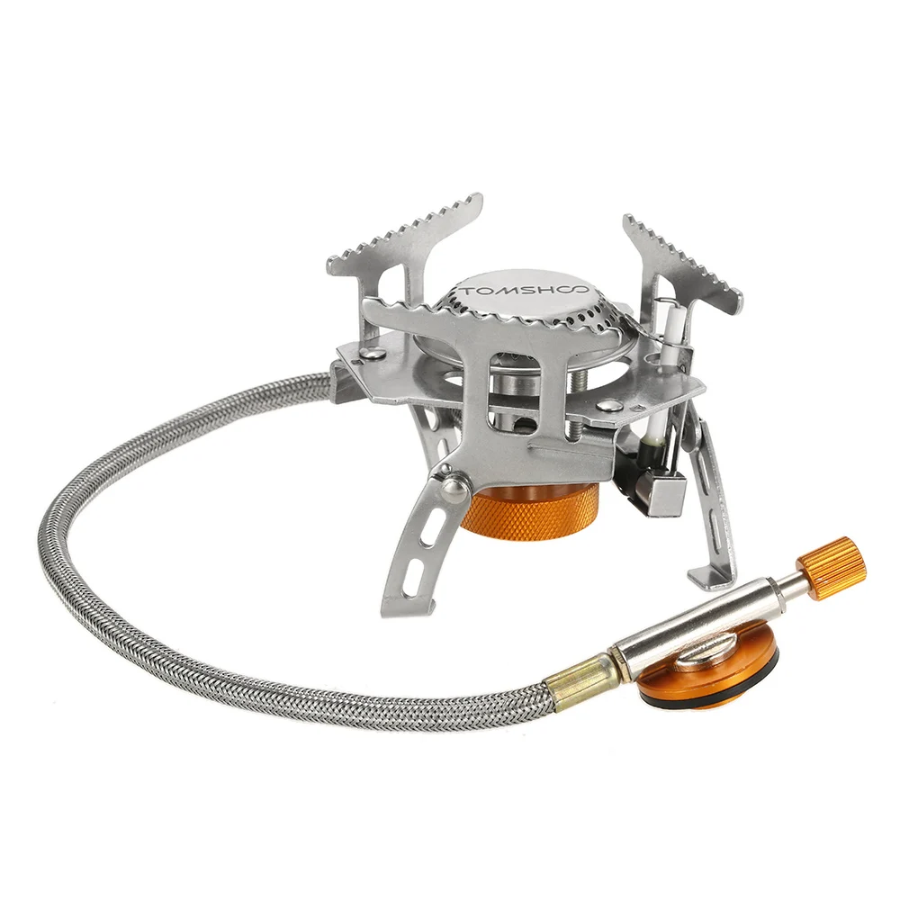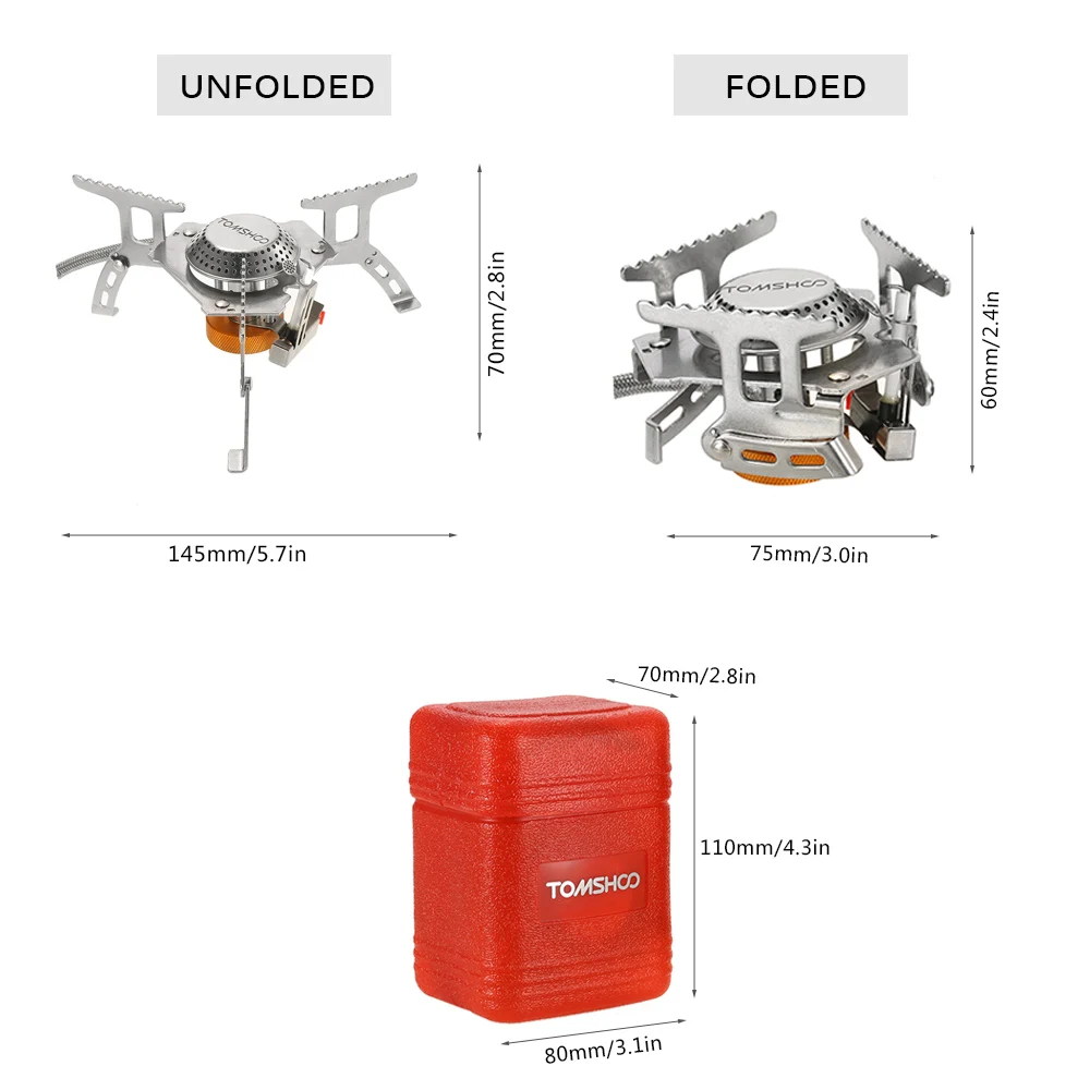 TOMSHOO camping stove includes a foldable gas stove, a 9-plate windshield and a gas cartridge converter. It is perfect for outdoor camping, hiking, backpacking, picnic, etc.
