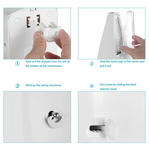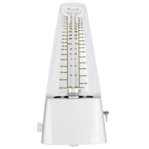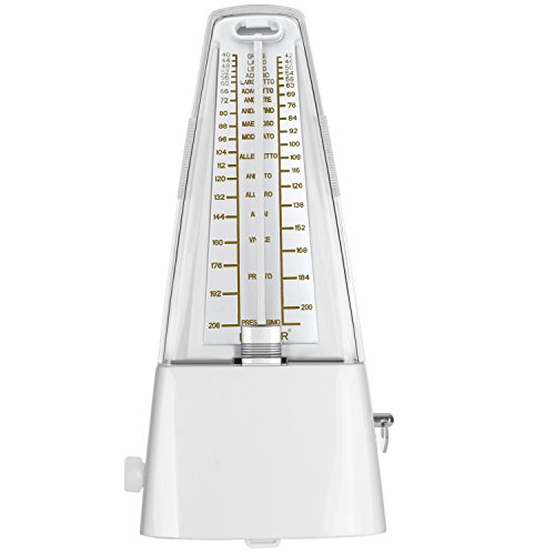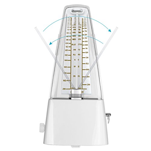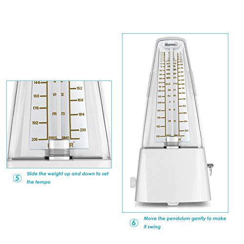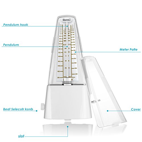 Description: Perfect practice tool to produce regular, metrical beats to help you play rhythms accurately. Improve your sense of beat and tempo. No battery is needed. The mechanical metronome uses a winding mechanism for power to produce metrical beats. Beat selection is: 0,2,3,4,6. Produce a clear and loud sound for use when practicing piano, violin, guitar, bass, drums and other musical instruments. The pendulum offers great visual tempo cues which makes it perfect for beginners learning difficult passages. Specifications: Color: White Material: Plastic Tempo: 40 to 208bpm Beat: 0,2,3,4,6 Dimension (approx.): 7.87x3.74x4.72 inches/20x9.5x12 centimeters Weight (approx.): 15.30 ounces/434 grams Warm Reminder: 1. Always put on the cover after practicing. 2. Avoid using or keeping the metronome in a dusty or damp place. 3. Only use soft cloth to clean the metronome. Package Contents 1 x Wind Up Mechanical Metronome 0