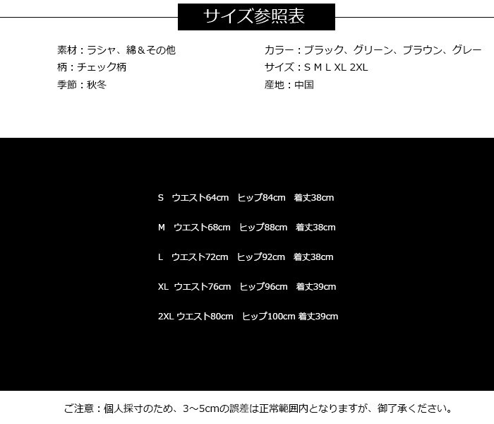スカート 秋 レディース ハイウエスト スカート ショート丈 タイトスカート OL 通勤 オフィス2018秋冬新作 スカート 秋冬 レディース フレアスカート 膝丈商品詳細素材:ラシャ、綿&その他柄:チェック柄季節:秋冬カラー:ブラック、グリーン、ブラウン、グレーサイズ:S M L XL 2XL 産地:中国サイズ参照表S ウエスト64cm ヒップ84cm 着丈38cmM ウエスト68cm ヒップ88cm 着丈38cmL ウエスト72cm ヒップ92cm 着丈38cmXL ウエスト76cm ヒップ96cm 着丈39cm2XL ウエスト80cm ヒップ100cm 着丈39cmご注意:個人採寸のため、3~5cmの誤差は正常範囲内となりますが、ご了承ください。スカート 秋 レディース ハイウエスト スカート ショート丈 タイトスカート OL 通勤 オフィス2018秋冬新作 スカート 秋冬 レディース フレアスカート 膝丈